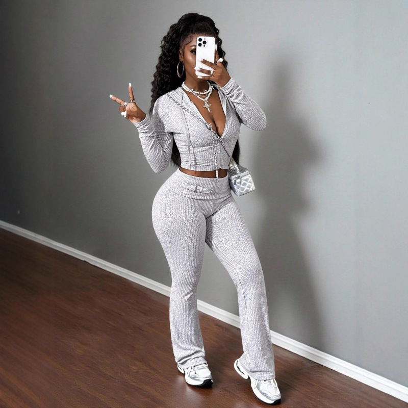 Knitted Ribbed Two-piece Full-length Pants Set