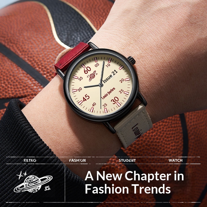 Colors: L-9565 silver case, beige dial with pink numerals, pink strap (S); L-9565 silver case, gray dial with black numerals, khaki strap (S); L-9565 silver case, white dial with black numerals, gray strap (S); L-9565 black case, beige dial with black numerals, black strap (S); L-9565 black case, beige dial with fuchsia numerals, red strap (S); L-9565 black case, khaki dial with black numerals, khaki strap (S)