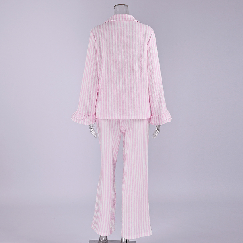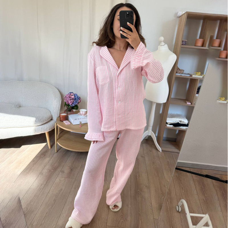 Double-layered Crepe Cotton Skin-friendly Striped Long-sleeved Trouser Set