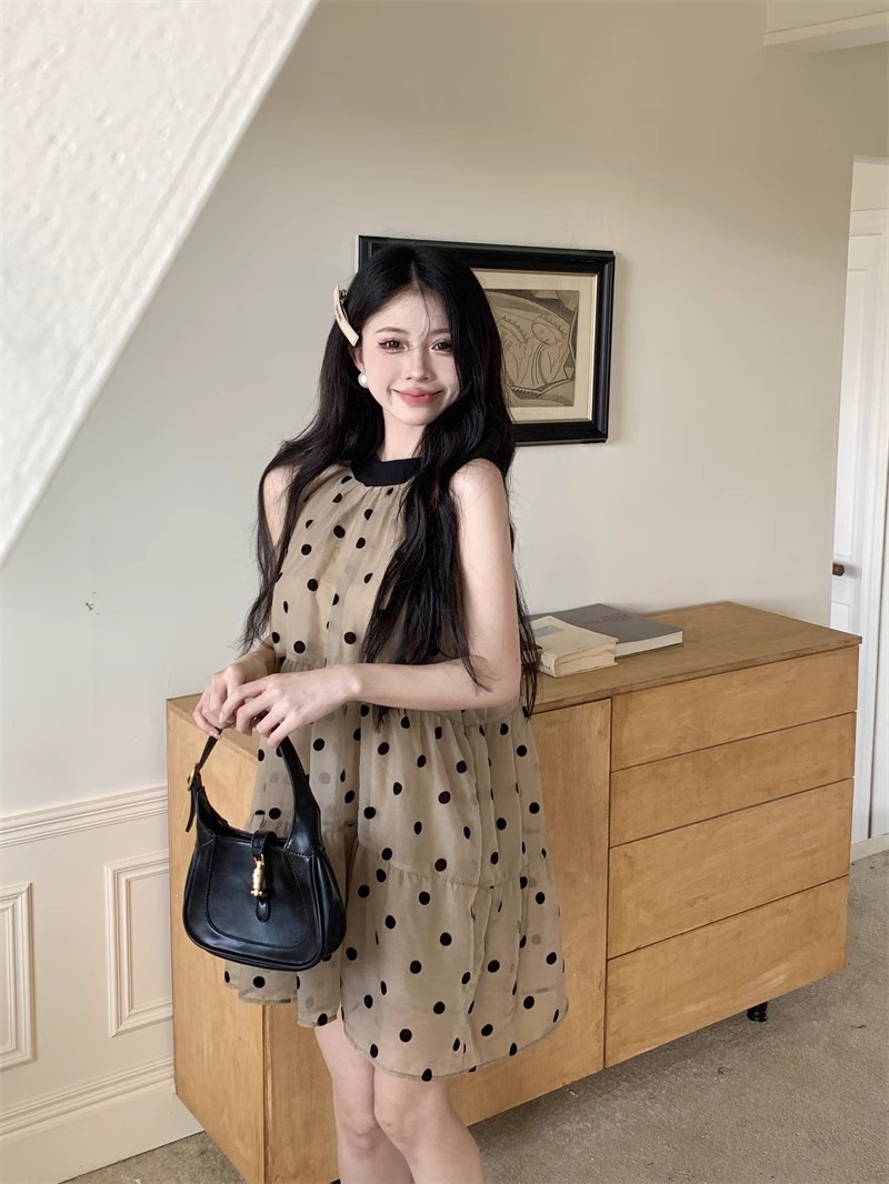 French-style Sleeveless Off-Shoulder Polka-Dot Dress