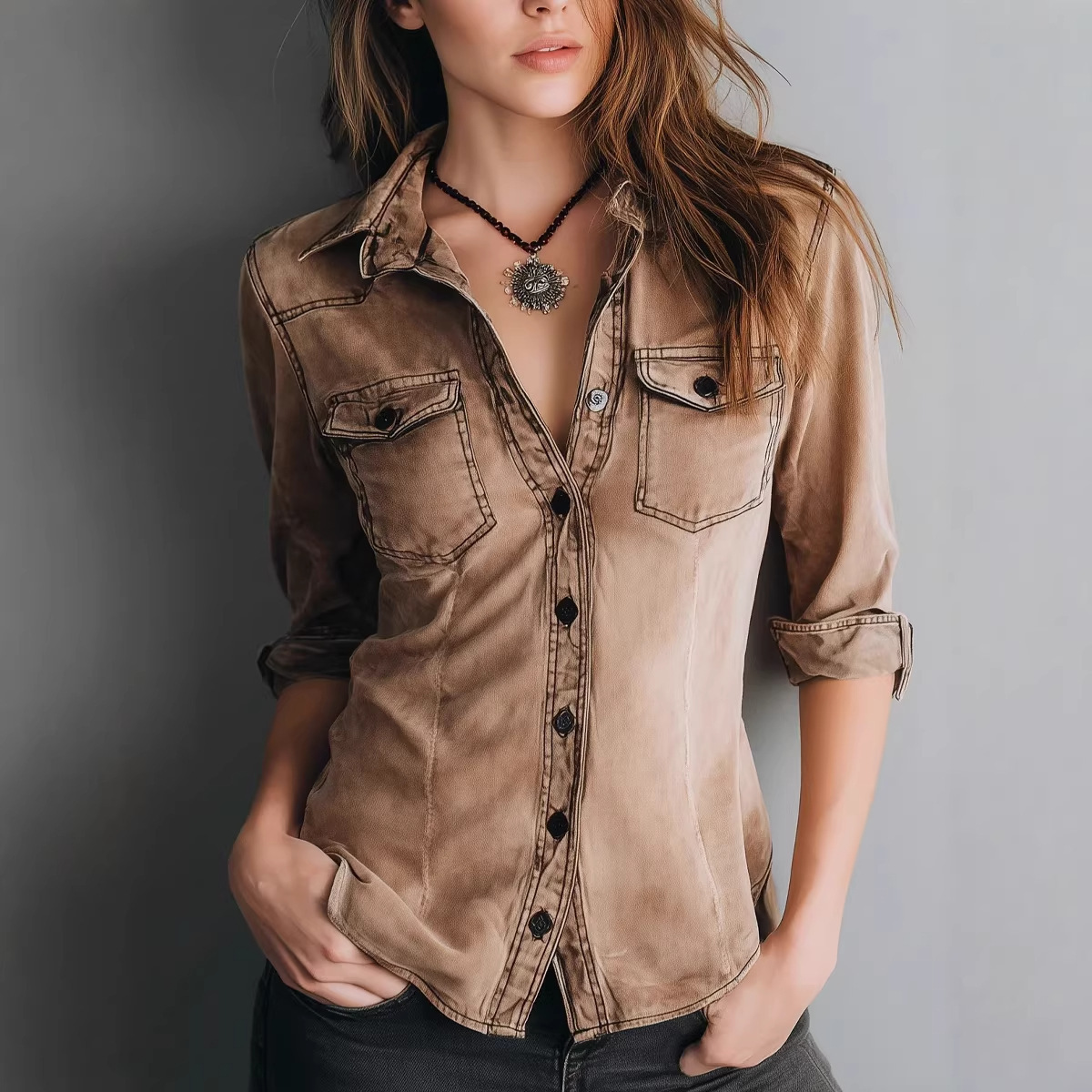 Retro Pleated Lapel Shirt Top Slimming And Figure-flattering