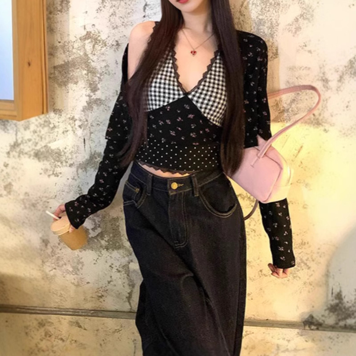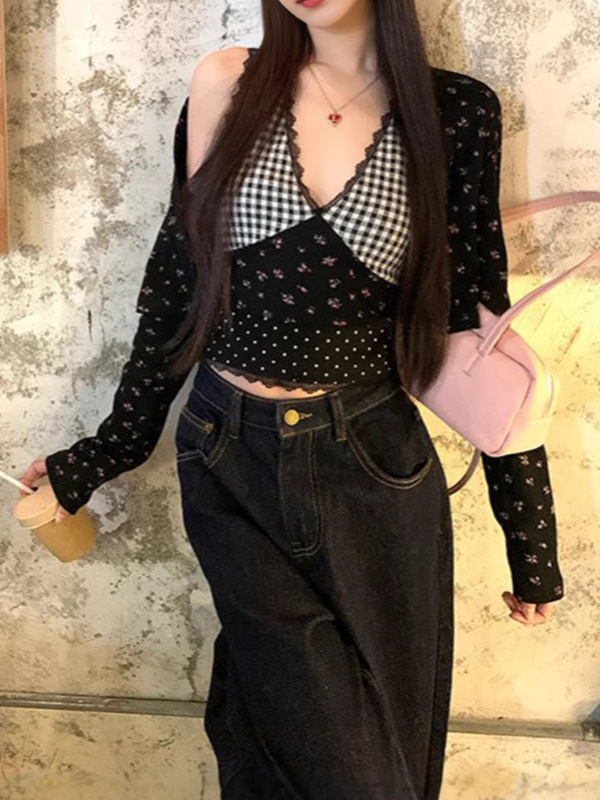 Pattern: Sexy V-neck short top + cardigan two-piece set