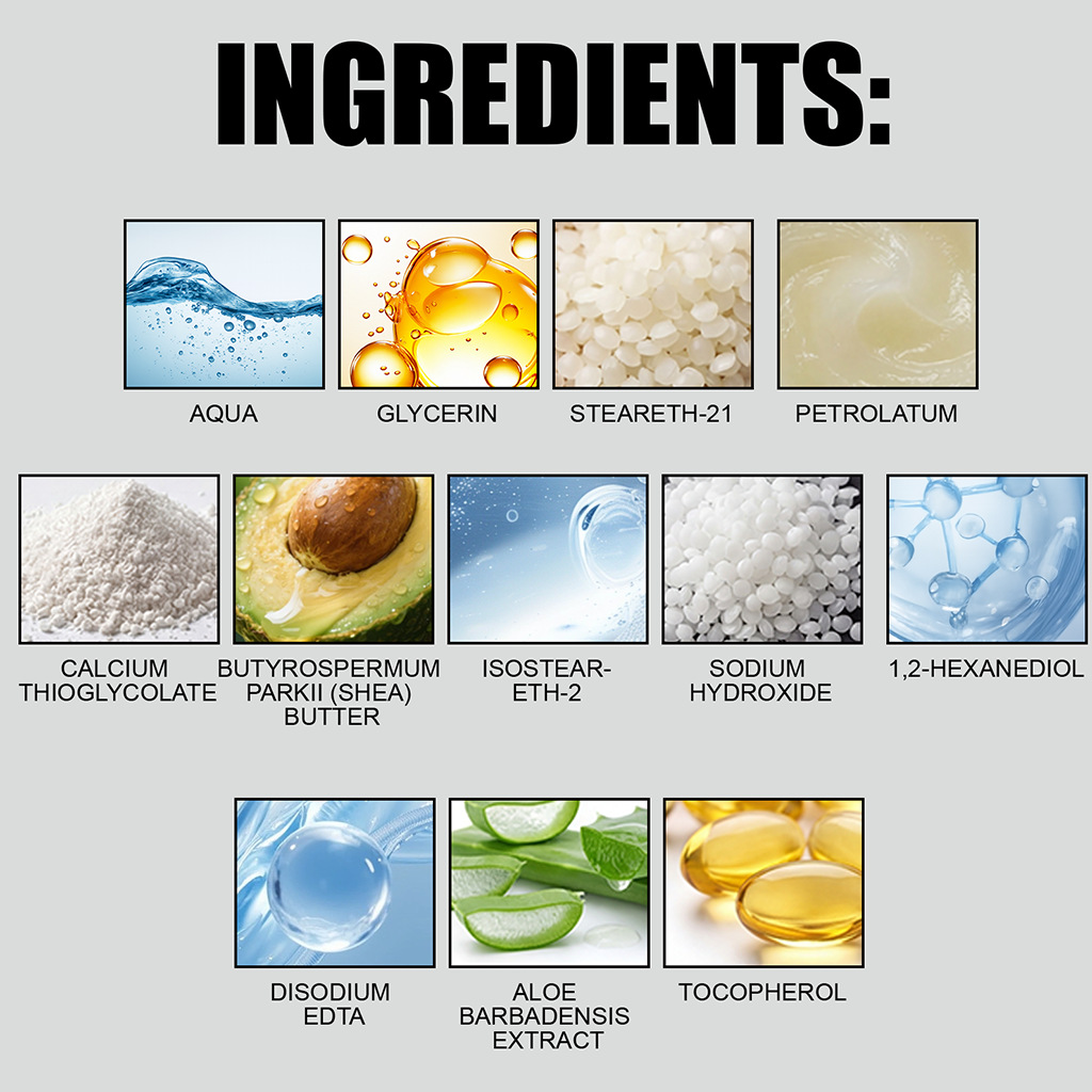 Ingredients: water, glycerin, stearyl polyether -21, petrolatum, calcium thioacetate, shea butter, stearyl polyether -2, sodium hydroxide, 1,2-hexanediol, EDTA disodium, aloe vera extract, tocopherol (vitamin E).