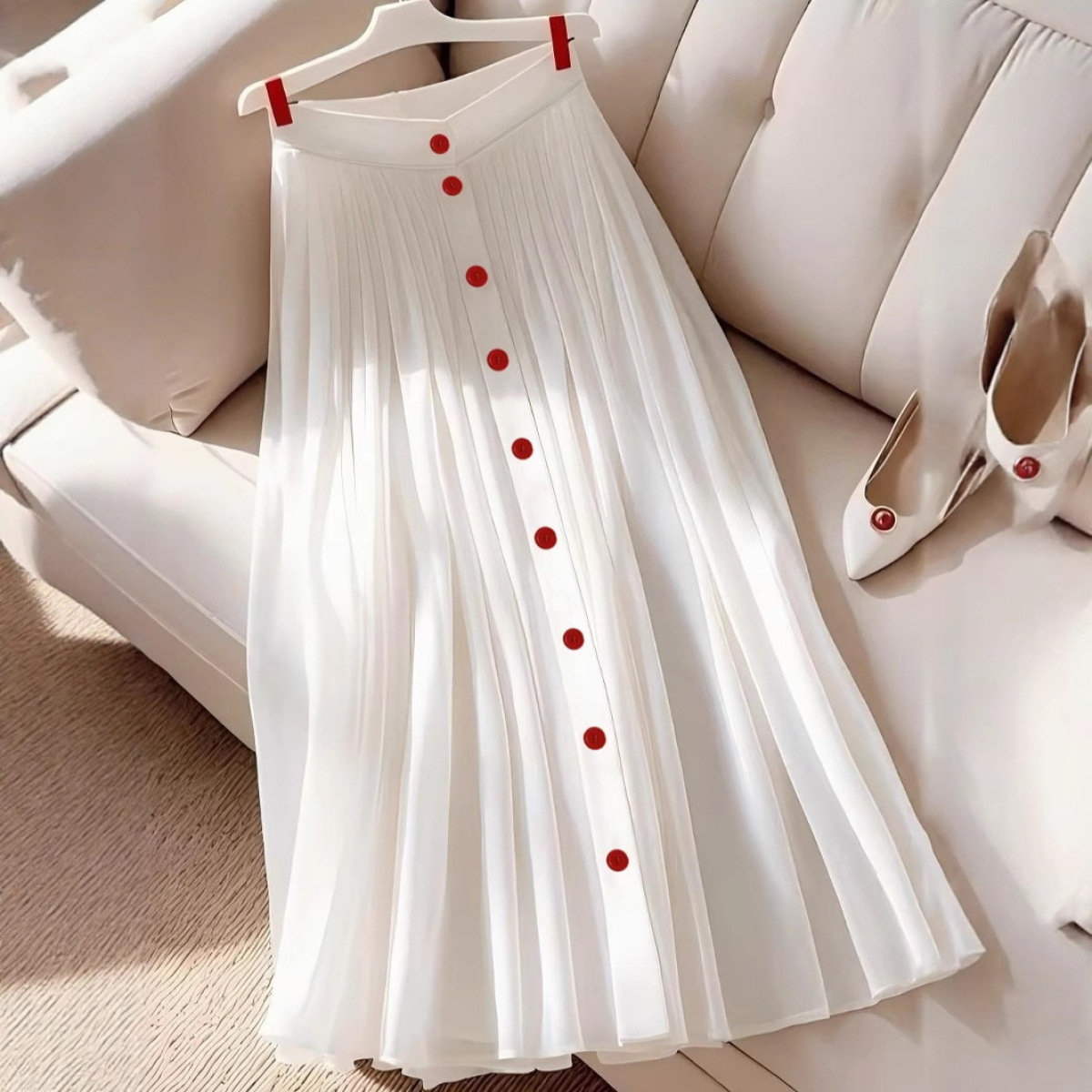 Womens High-Waisted White Pleated Fashionable Versatile Slimming Skirt