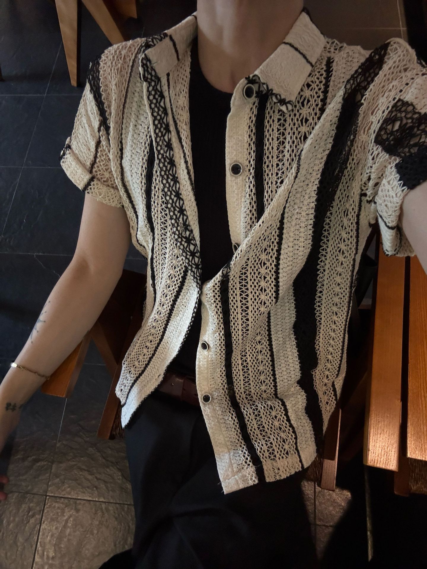 Striped Contrasting Color Hollow-Out Knitted Short-Sleeve Shirt