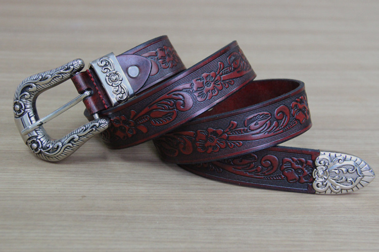 First layer cowhide small rose carved ladies belt