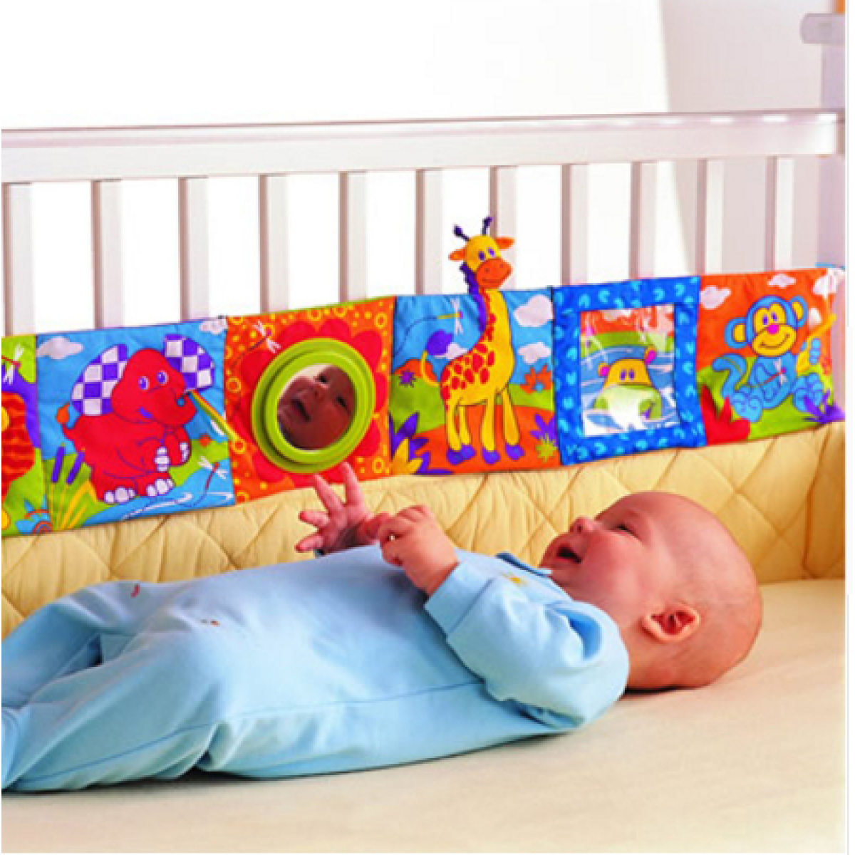 Fit for one side only, not for the whole crib: side 2 is brightly colored with tactile activities for the 2nd stage of development. Easily folds up and can be taken anywhere with baby. Touch-and-feel quilted book features offer a variety of soft and furry animals inside - perfect for baby's tiny fingers to pet and lift to discover.