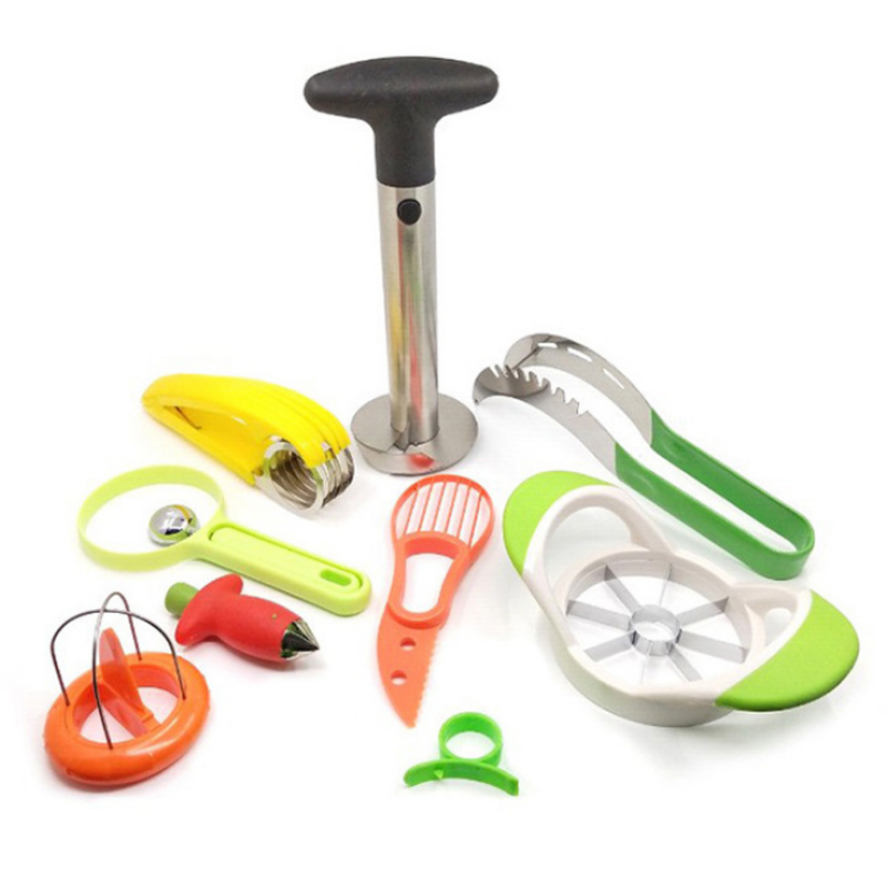 product name Nine sets Product specifications 23*13*16 cm Product Size As shown Qty 20 PCS product material Stainless steel, environmentally friendly plastic Box gauge 65*47*32 cm Product weight 700 g Gross weight 14/15 KG Product packaging Carton (support customization) Package included Pineapple meat extractor*1, watermelon meat extractor*1, apple slicer*1, hand clip banana slicer*1, strawberry to pedicle*1, digging avocado device*1, peeling ball digger*1, digging Kiwifruit*1, open orange*1