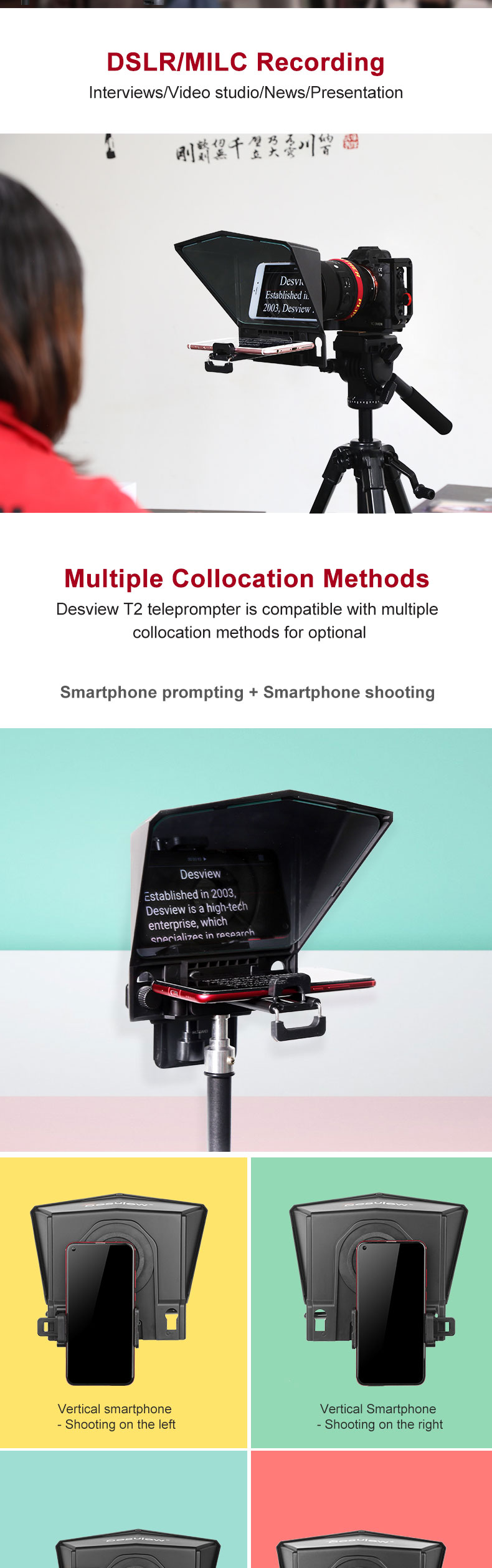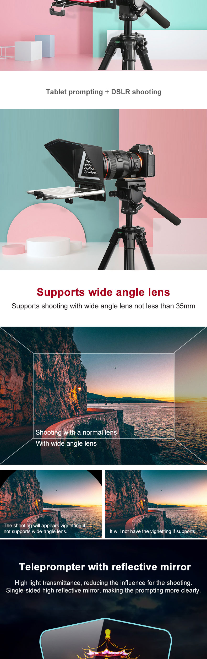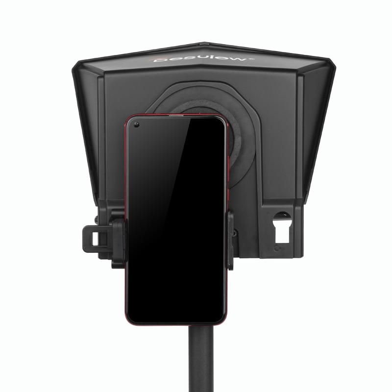 Packing list: teleprompter, mobile phone holder, mobile phone/tablet holder, adapter ring, remote control, hexagon wrench + screws, foam ring, dust cloth + manual