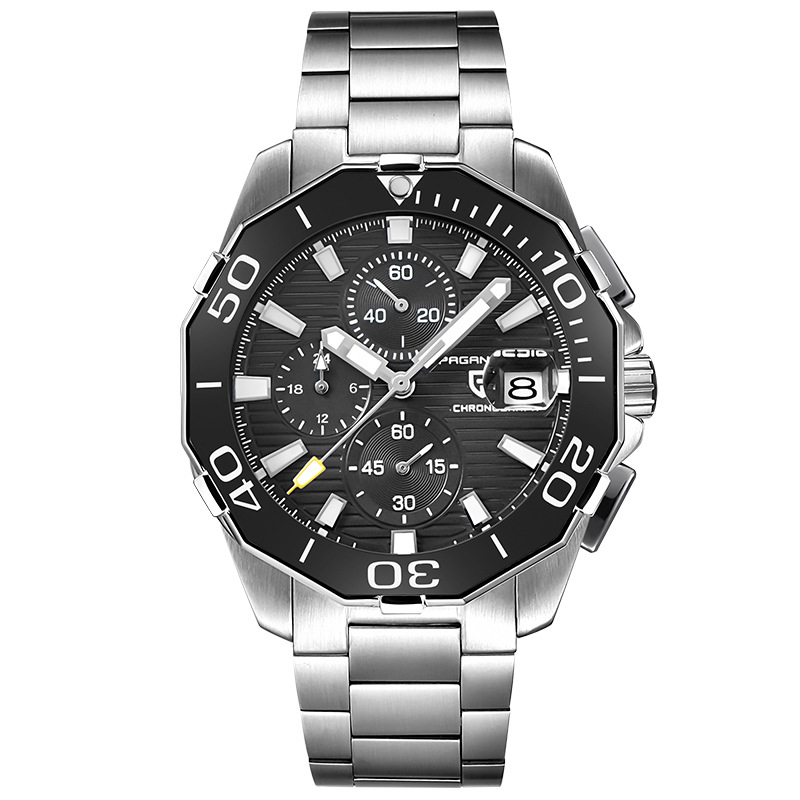 Additional features: world time, chronograph, calendar, small three needles