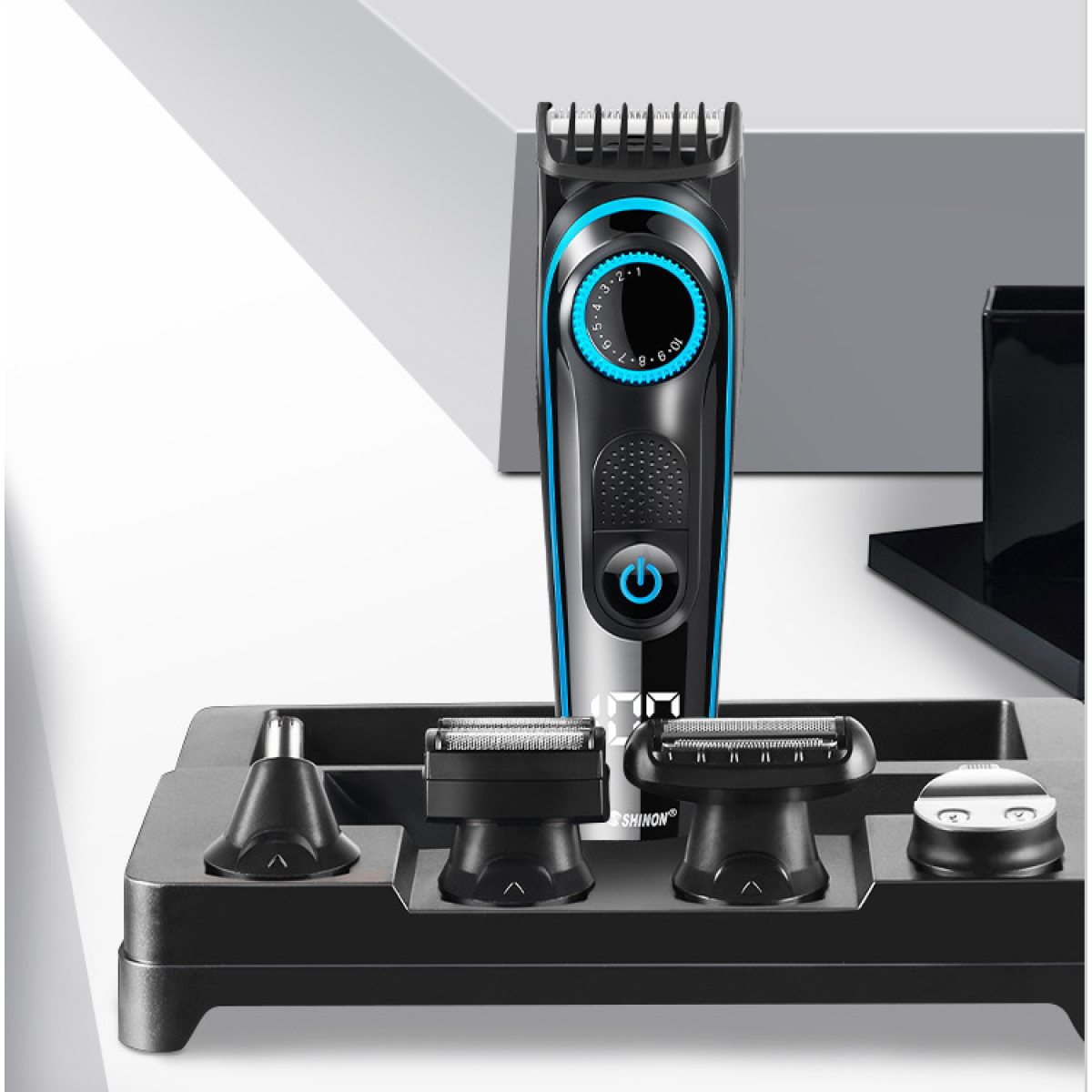 Product accessories: host + barber blade + carving blade + nose hair trimmer + temple blade + shaving blade + English manual + USB charging cable + cleaning brush.