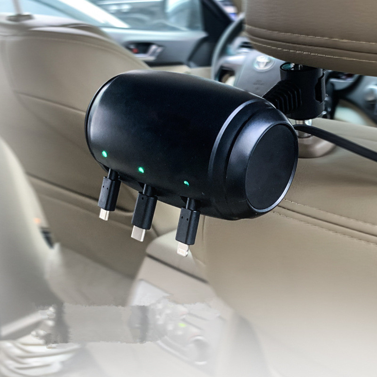 The headrest charger 3-in-1 charging is no longer limited to the front seats. It is equipped with a 1.5-meter cable and three different ports; micro-USB, USB-C, lighting, so you can charge 3 devices at the same time when traveling by car.