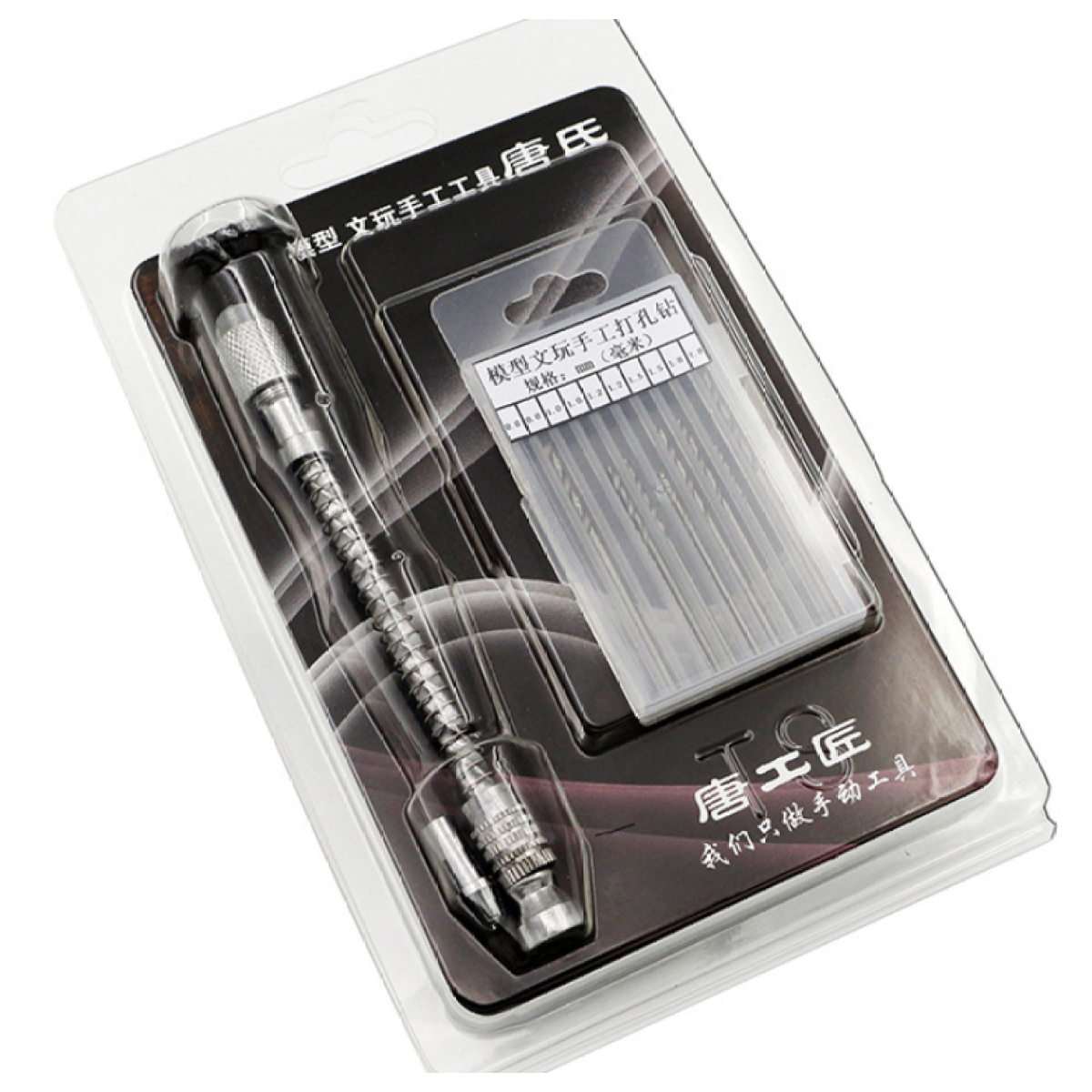 The set contains: a semi-automatic hand twist drill with a drill bit between 0-2mm, ten drill bits with 5 sizes: 0.8 1.0 1.2 1.5 1.8
