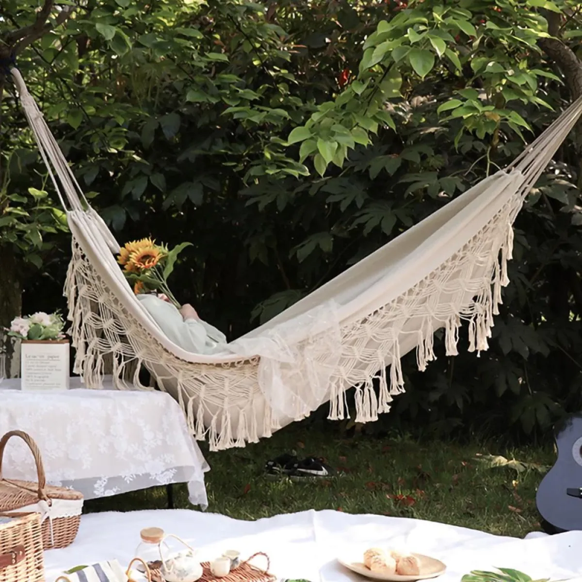 *2. Spacious and comfortable: This hammock is 200cm x 150cm, with enough space for two people to relax. Soft, thick cotton can hold 250kg.