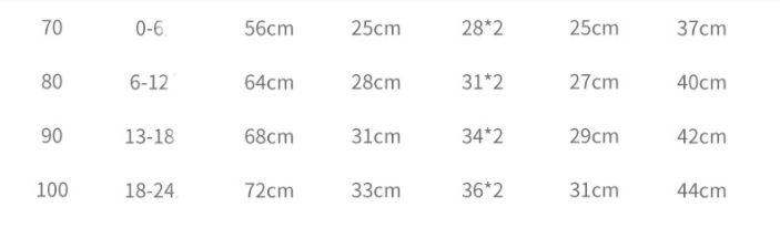 Size---recommended age---length---sleeve length---1/2 bust---shoulder width---shoulder to crotch