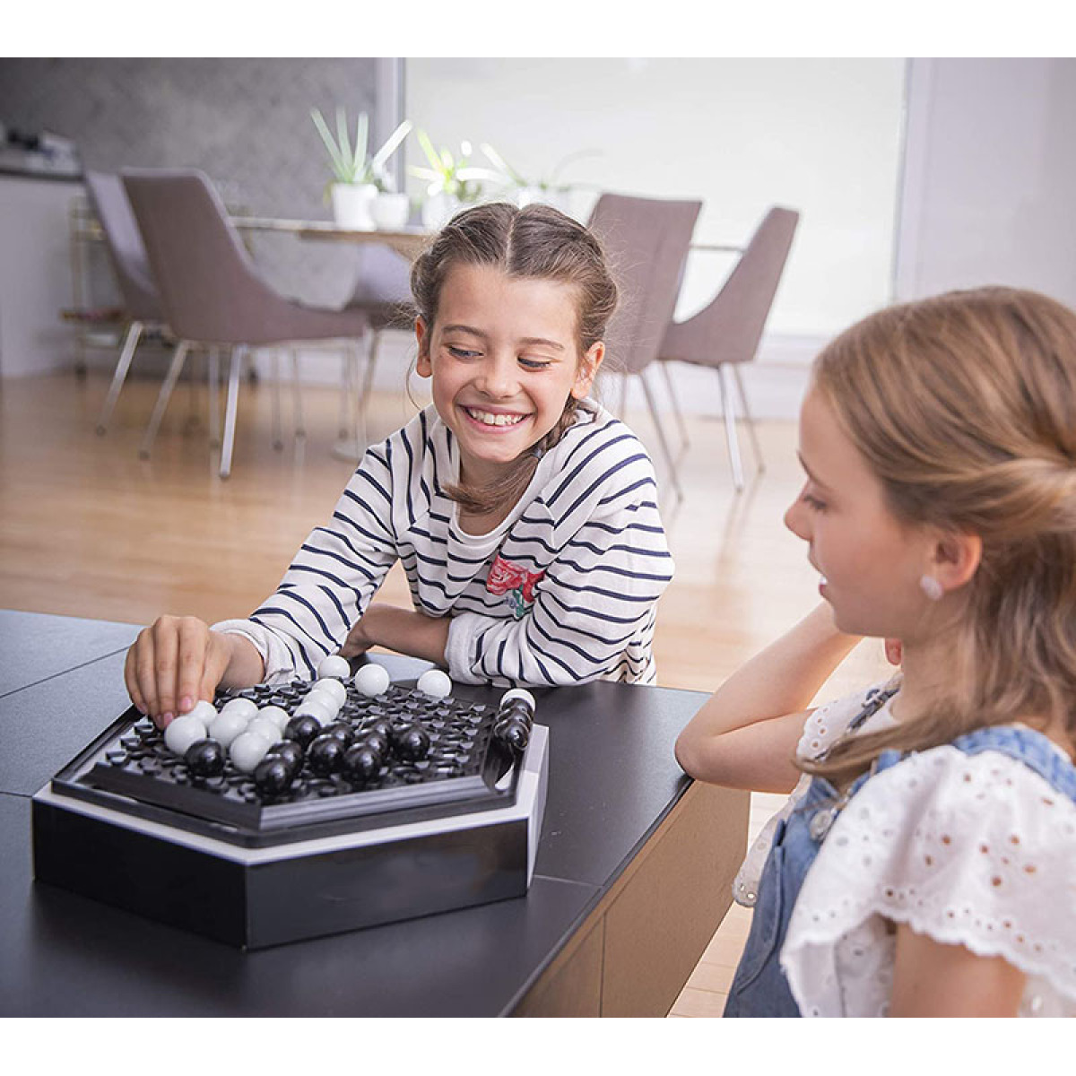 This beautiful and functional board has room for two teams of large marbles. Players take turns pushing the marbles around the board, with the goal of pushing six of the opposing player's marbles off the board. The central idea is that a column of marbles has weight given by the number of marbles in line. Someone will need to push with a heavier group of marbles in order to push the column along that axis. However, with six possible directions, it's difficult to defend yourself perfectly. Also, it's possible to play the game with up to six players when supplemental marble sets are purchased.