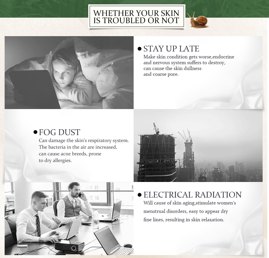 ●STAY UP LATE:Make skin condition gets worse,endocrine and nervous system suffers to destroy, can cause the skin dullness and coarse pore. ●FOG DUST:Can damage the skin's respiratory system.The bacteria in the air are increased,can cause acne breeds, proneto dry allergies. ●ELECTRICAL RADIATION:Will cause of skin aging,stimulate women'smenstrual disorders, easy to appear dry fine lines, resulting in skin relaxation.
