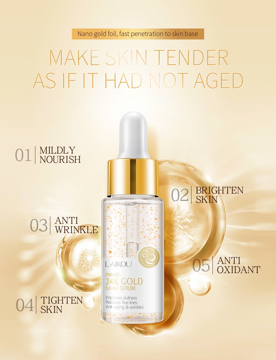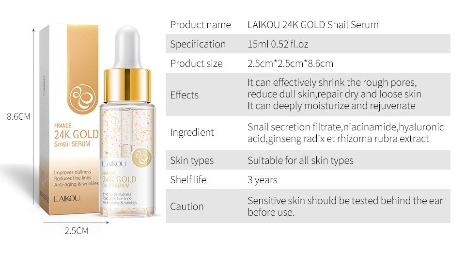 Product name LAIKOU 24K GOLD Snal Sreum Spelication:15ml0.52 fLo2 Product siae:25cm2 5cm"880m Efects:It can ffectively shink the fough pores,reduce dull skinrepairdry and loo5e skin It can deeply moisturize and rejuvenate Ingredient:Snail secetion ftrateniacd namide hyaluronic axid giseng radix et rhizoma rubra eitract Skin types:Sutable for al shin types Shelf lle:3years Caution:Sens tive skin should be tested behind theear betore use.