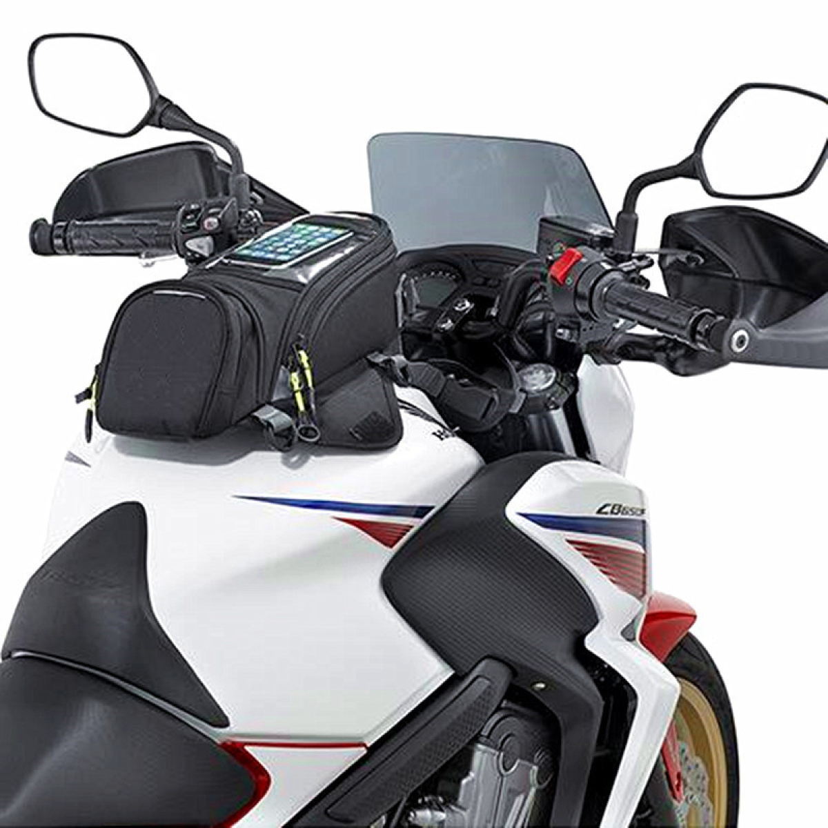 Practical method: magnet fixing Plastic fuel tank can also be fixed (4 straps included, 1 single shoulder strap) Delivery rain cover! Comes with a hand strap and belt!