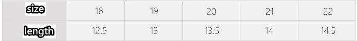 Sizes: 18 / insides 12.5cm,19 / insides 13cm,20 / insides 13.5cm,21 / insides 14cm,22 / insides 14.5cm,23 / insides 15cm,24 / insides 15.5cm,25 / insides 16cm,26 / insides 16.5cm,27 / insides 17cm