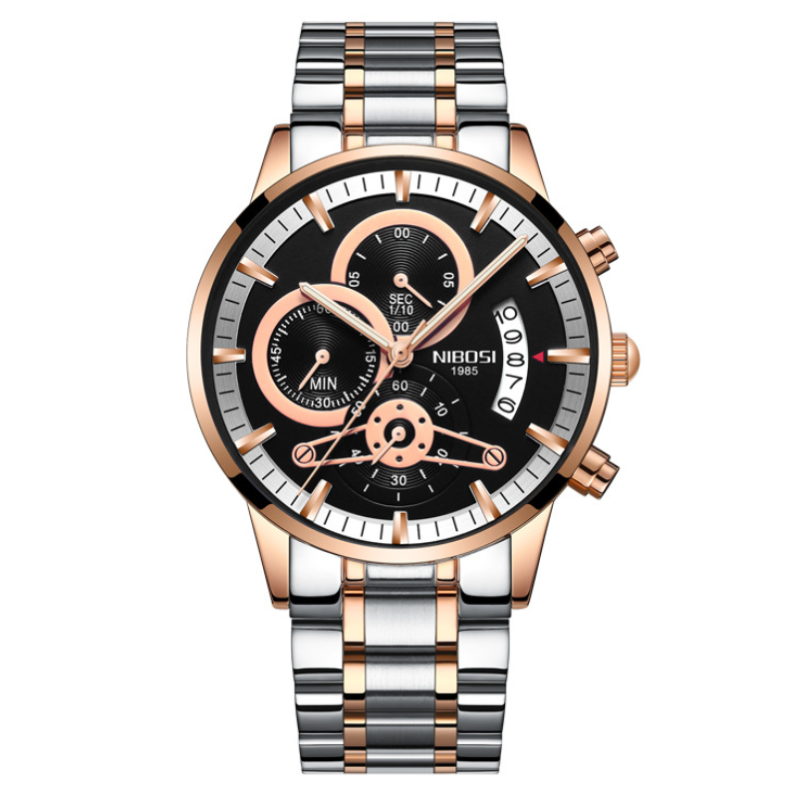 Special features: luminous, week display, chronograph, countdown, calendar, small three-pin