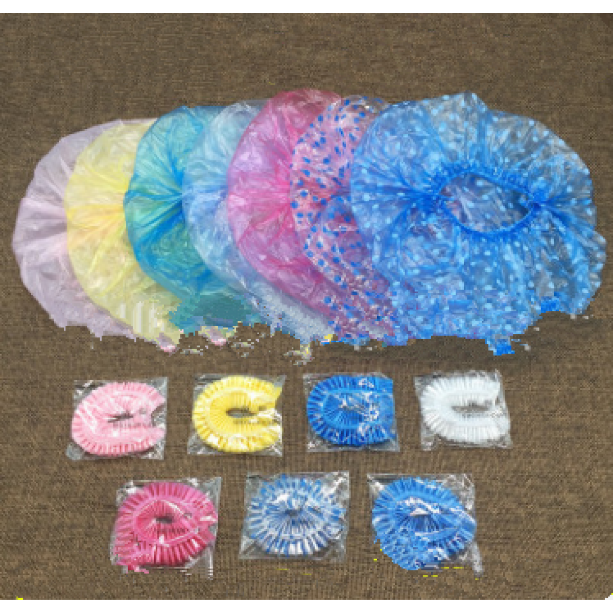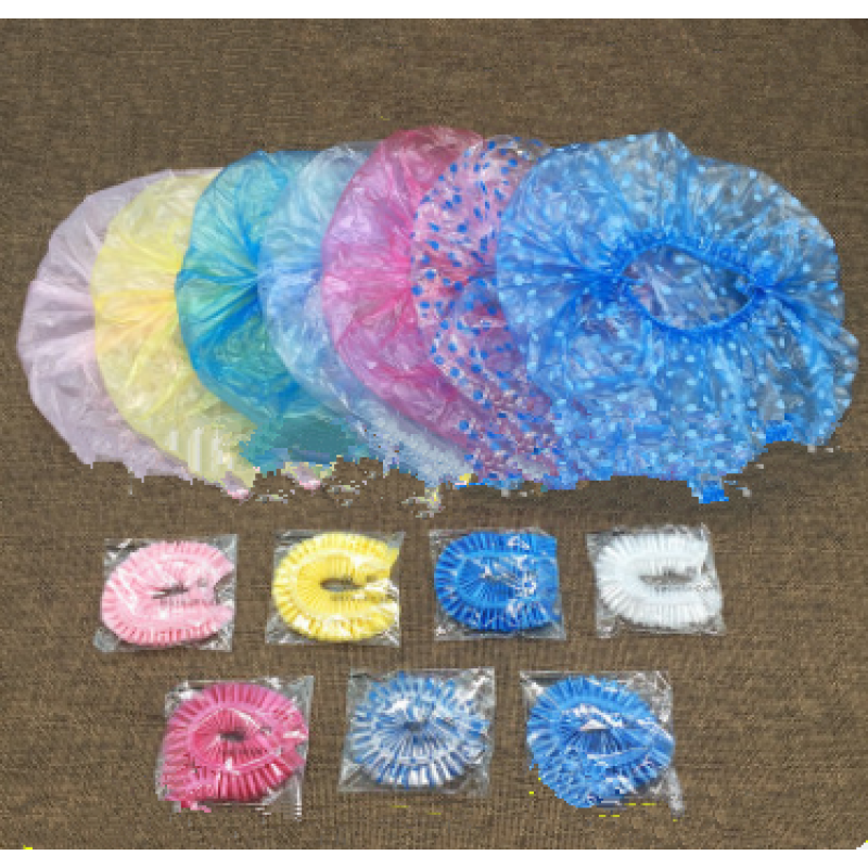 Disposable Shower Caps, made of plastic material in clear blue, clear pink, clear yellow color.