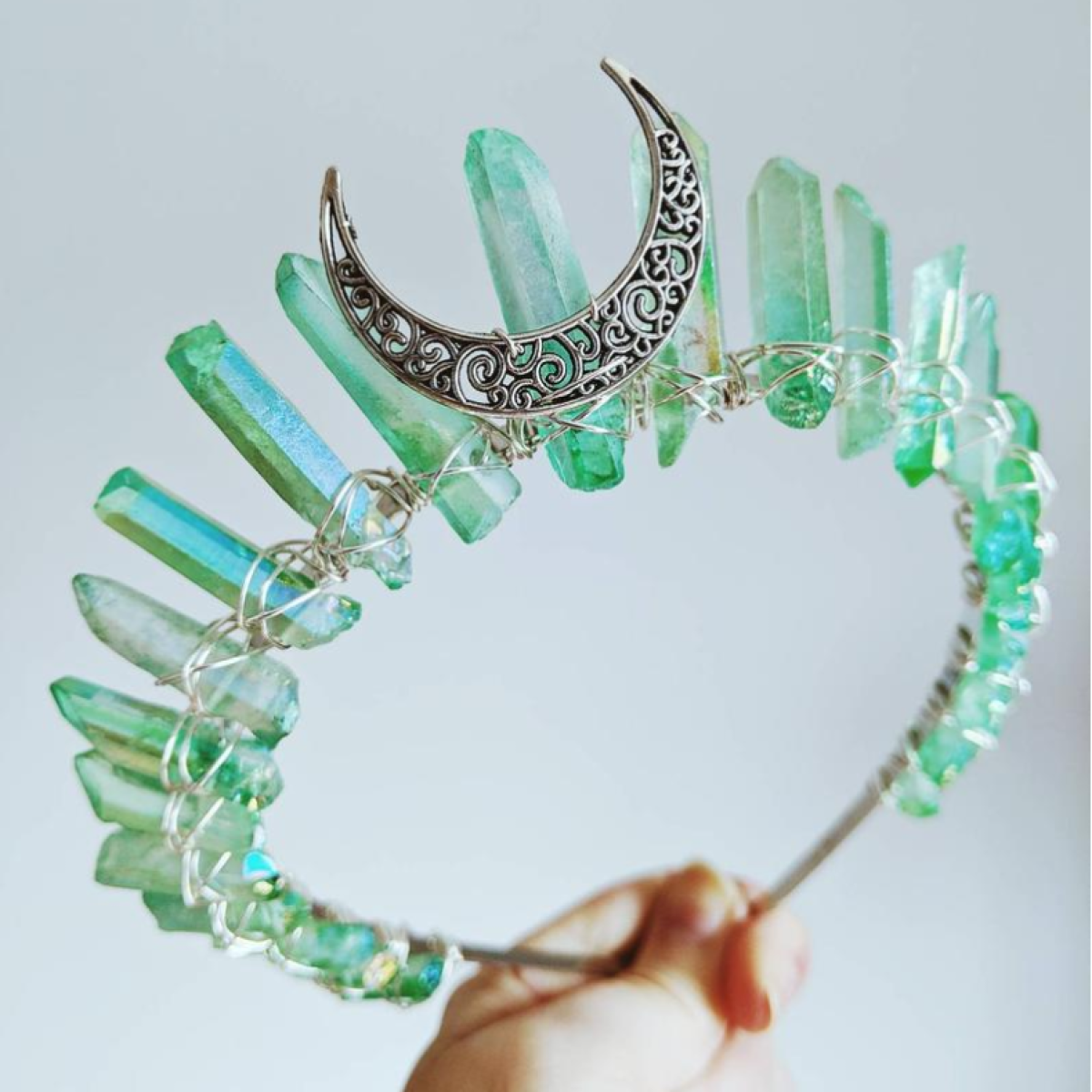 Handmade contrast color raw crystal quartz, hollow out metal alloy crescent moon center decoration, winding with wire.