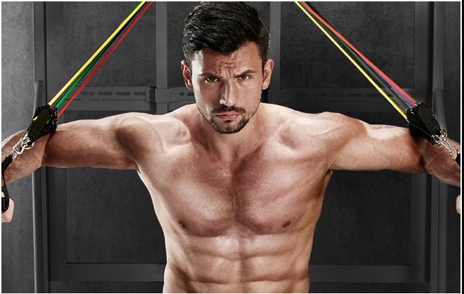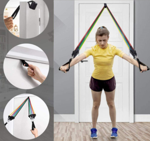 Adjustable resistance bands in different colors: yellow (10 pounds), green (20 pounds), blue (30 pounds), black (40 pounds), red (50 pounds). It can be used alone, stacked in any combination, and the maximum equivalent strength is 150 pounds.