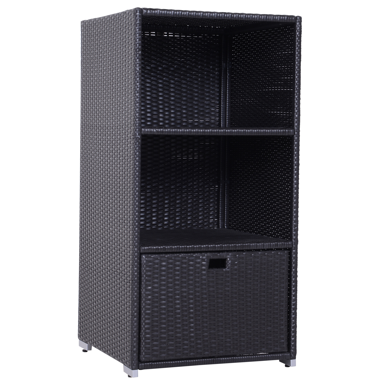 Keep your towels and pool accessories always close by with the convenient [BRAND NAME] 47'Rattan Wicker Outdoor Pool Towel Valet Stand. Constructed from durable aluminum and all-weather PE rattan wicker this handy towel storage cabinet features 2 upper shelves and a large bottom drawer for additional storage options. Add one to your pool or spa deck and impart the look and feel of a resort or private club to your own backyard!