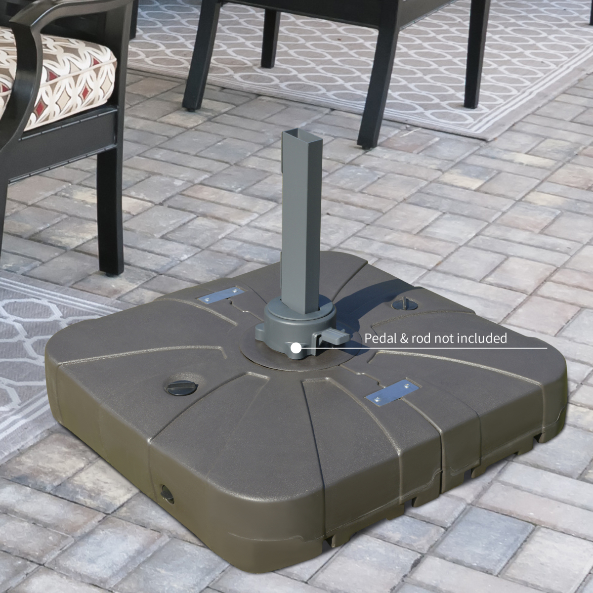 Enjoy the outdoor lifestyle with this [BRAND NAME] outdoor umbrella stand. Our umbrella stands for outside is suitable for most cantilever umbrellas and can be filled with either 330 lbs of sand or 249 lbs of water for pure weight and stability. There are two ports to fill this sand or water: one on top meant for filling, and one on the side meant for draining. Furthermore, the patio umbrella holder has wheels on the side to easily move without hurting yourself.