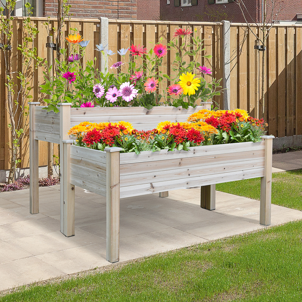 Let natural beauty lead the way in your garden this season with this raised bed planter from [BRAND NAME]. The two-tier design of our raised garden planter ensures flowers, vegetables, and herbs have plenty of room to grow. Meanwhile, the elevated levels of the plant bed means you won't have to bend down or strain your body while looking after your green friends. Our outdoor garden planters is made of fir wood frame to ensure a solid core. Great for growing indoors and outdoors.
