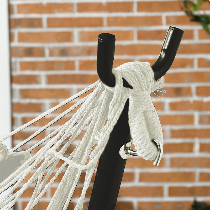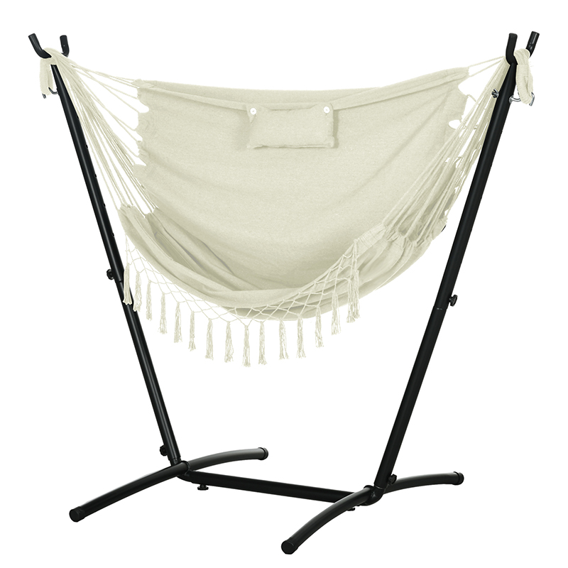 Whether you want to sit inside indoors or outdoors, an [BRAND NAME] hammock chair has your back. This hanging hammock chair has a horizontal design, providing you lots of space to lay back. It features boho tassels and an outdoor-ready build via powder-coated steel, so you can place a practical accent anywhere. Not only is this swing chair ergonomic enough to drink a cup of coffee, but it has a pillow to pad your head for long bouts of reading or watching a movie. Get out, get comfy, get [BRAND NAME].