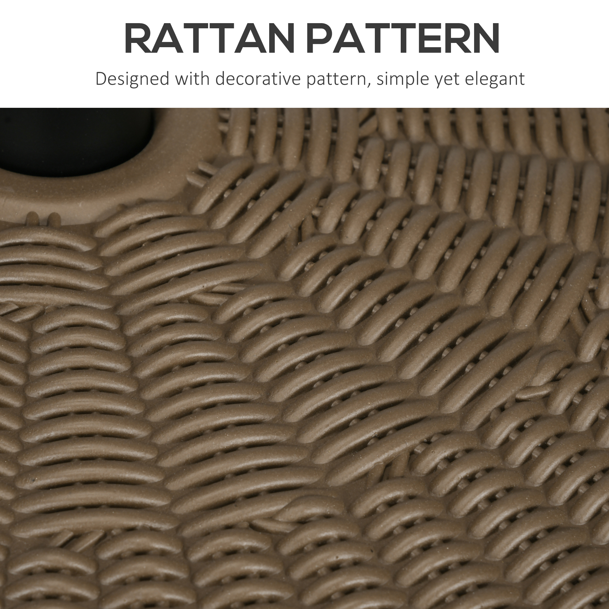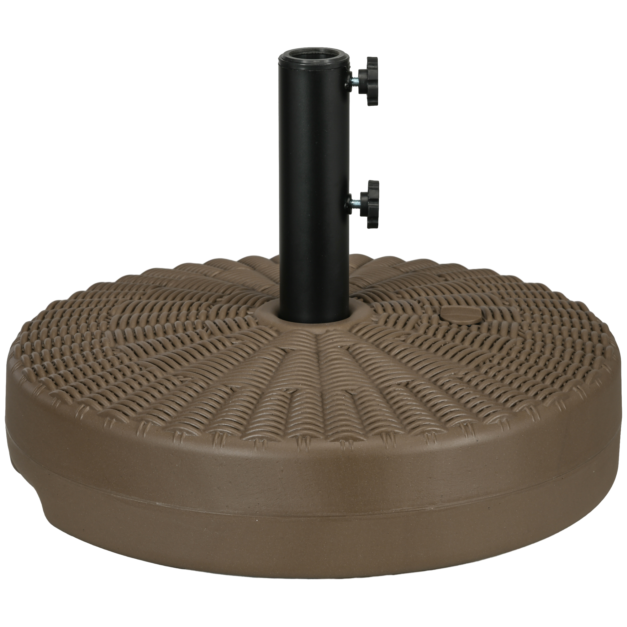 An [BRAND NAME] umbrella base doesn't just help your umbrella stand up it adds a delightful accent to your patio. With a large capacity, our fillable umbrella base can weigh up to 48 lbs. when filled with water or 64 lbs. with sand. It's made of all-weather HDPE plastic with an impressive whorl of rattan patterning. Two knobs secure your umbrella pole in place, allowing it to fit an array of sizes. When emptied, this umbrella base is lightweight and easy to carry. Get out, get comfy, get [BRAND NAME].