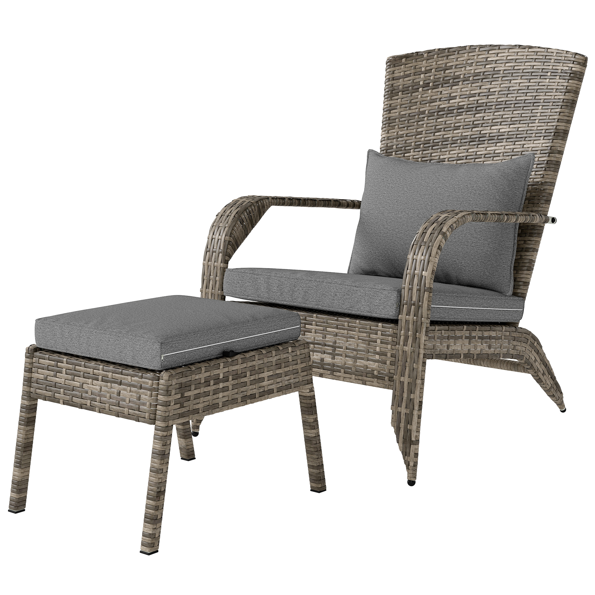 Like the look of wicker and wish an Adirondack chair could do more? [BRAND NAME] offers a hand-woven cushioned Adirondack with a high weight capacity ottoman. Put your feet up by the fire pit or have an extra seat when needed. This Adirondack has the same laid-back shape you're used to, with plush padding and a lighter build. An easy match to your existing patio furniture, PE rattan offers the style as classic wicker with greater resistance to UV and water. Get out, get comfy, get [BRAND NAME].