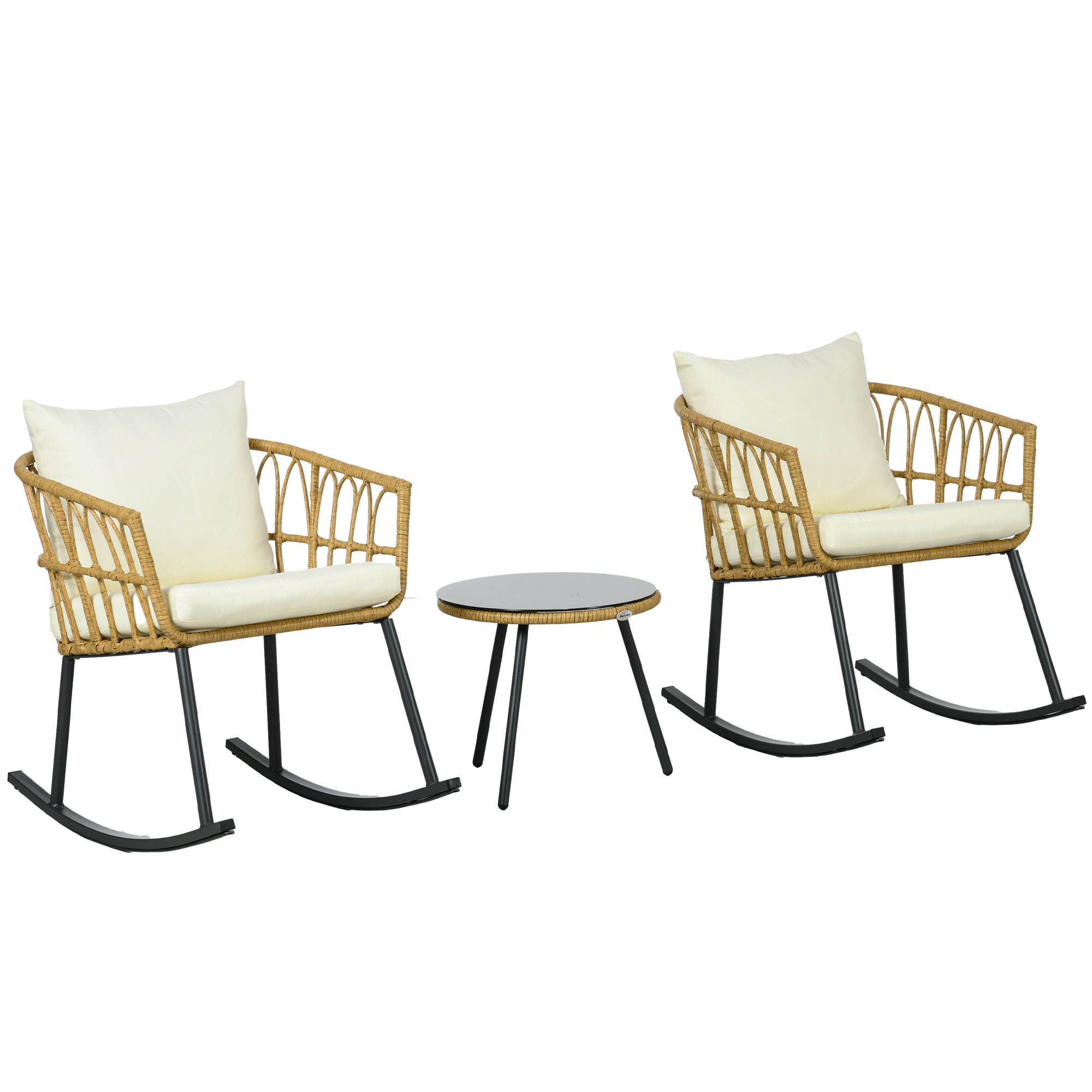 Timeless form and function come together on your front porch with the simple addition of an [BRAND NAME] 3 piece patio furniture set. Gently sway through the breeze while sharing a snack. Two rocking chairs and a table make the outdoors a place to enjoy with a friend. Crafted with hollow hand-woven PE rattan and fully cushioned, their barrel chair design makes them comfy to sit on and cozy on the eyes. Get out, get comfy, get [BRAND NAME].