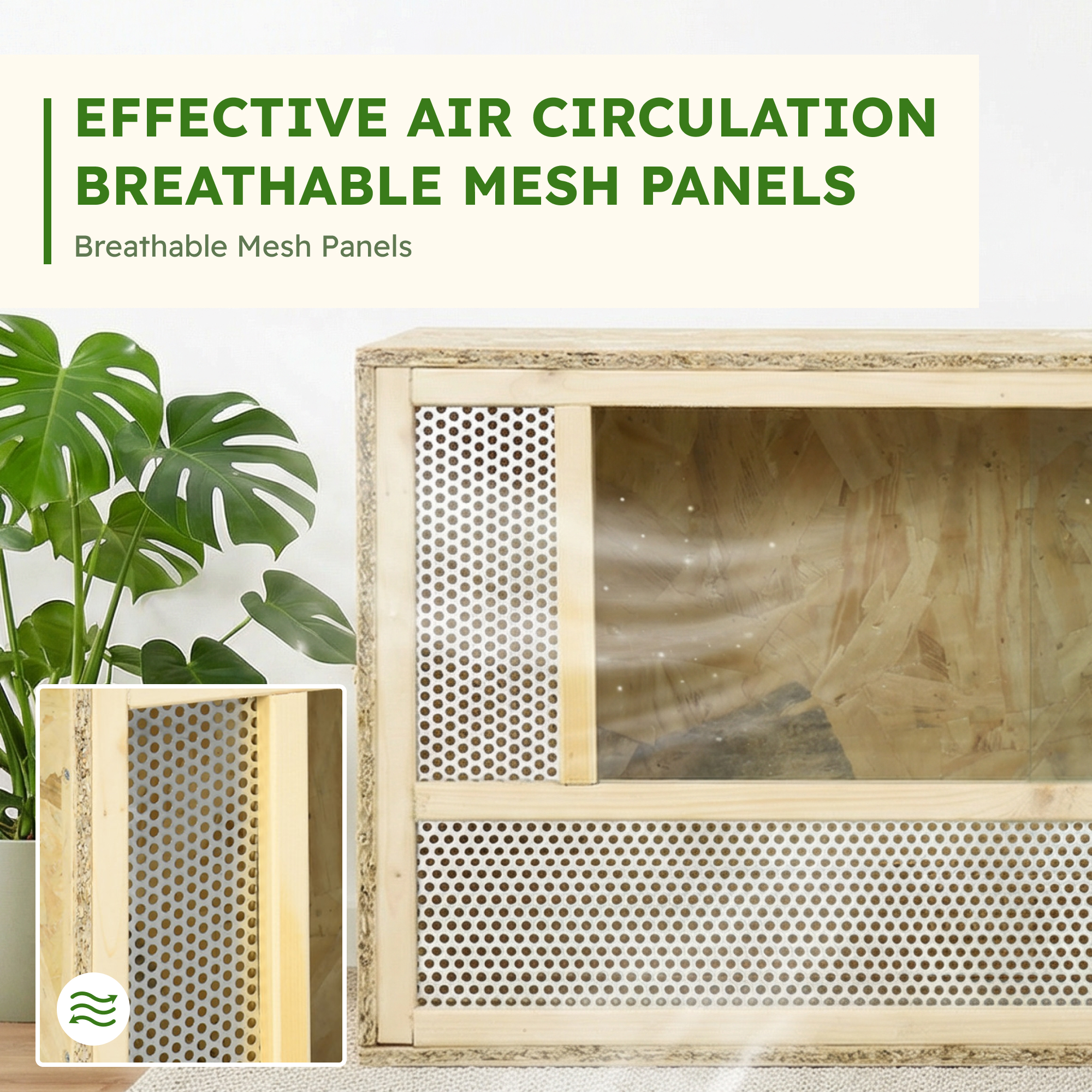 Reptiles thrive in their habitat, so this [BRAND NAME] reptile tank is a great choice. You can create land water or emulate a rainforest by yourself, making reptiles feel right at home. Breathable mesh panels for proper ventilation, keeping pets cool when inside, while the OSB panels enhance stability. The large glass door lets you watch them in their natural surroundings. Place a heating pad at the bottom; whatever surroundings they need it can be created.