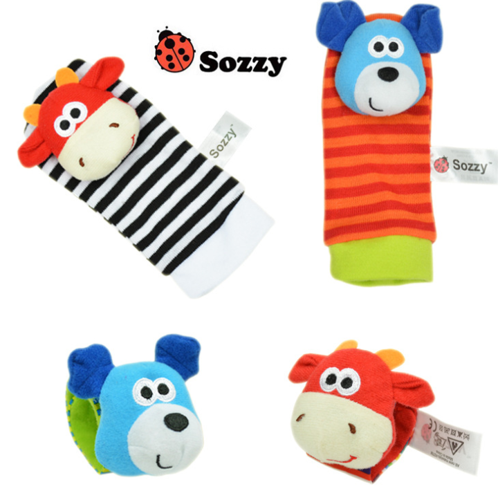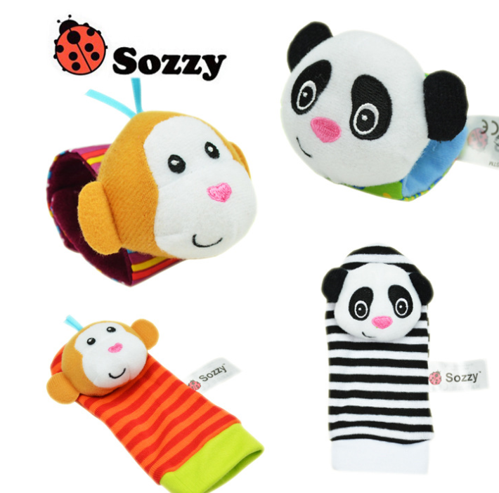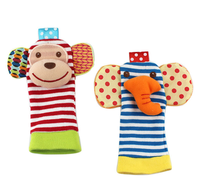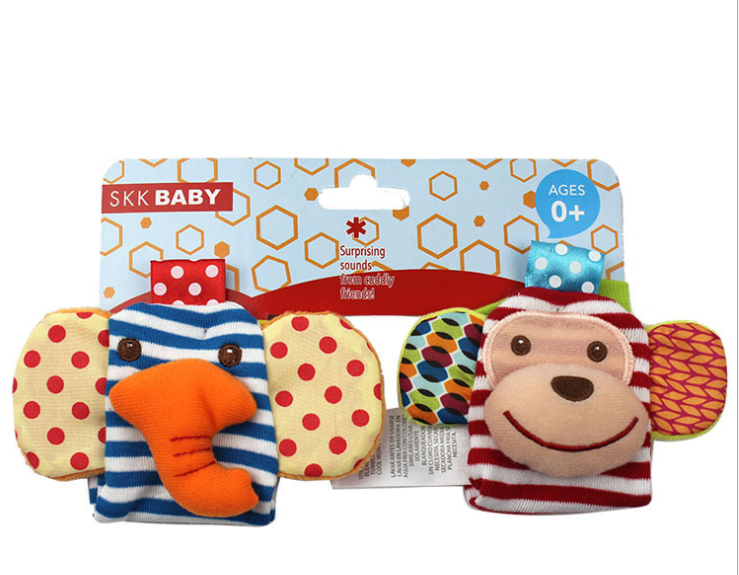 Moms can bring the wrist bell to the baby and teach the baby to recognize the orange monkey and the blue elephant