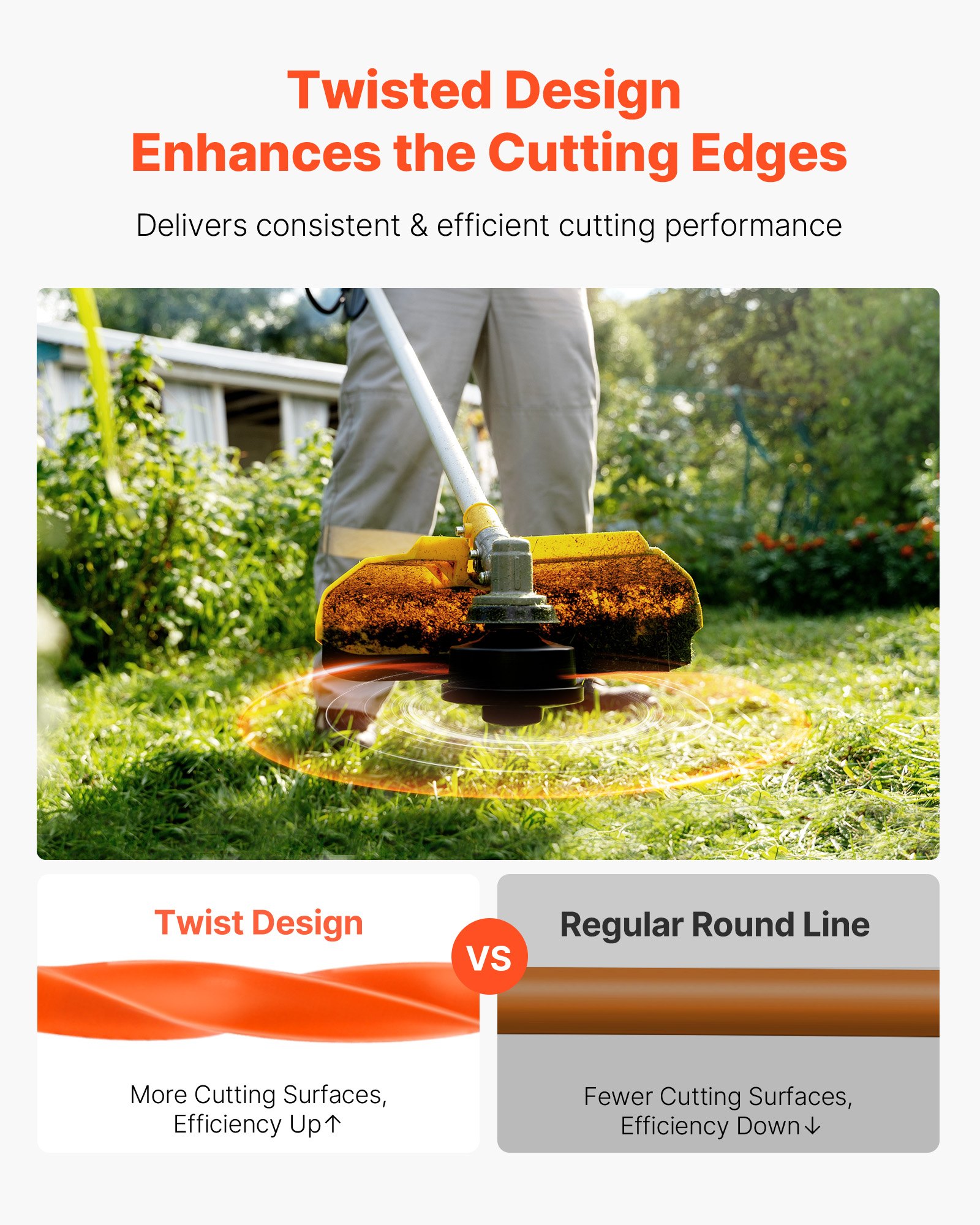 Efficient Weed Cutting: This twisted string trimmer line structure penetrates dense weeds and hard stems smoothly, with enhanced cutting power and speed compared to round lines