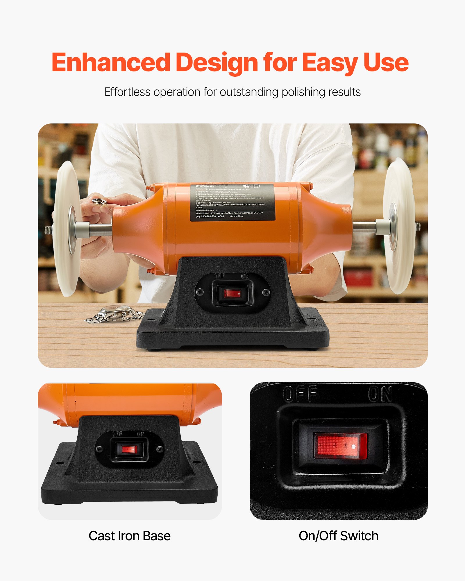 Dual-Wheel Configuration: The bench polisher includes 2pcs 6-inch cloth wheels, ideal for metal, wood, and jewelry polishing. The soft cloth material is gentle on surfaces, perfect for detailed polishing while enhancing shine and removing fine flaws