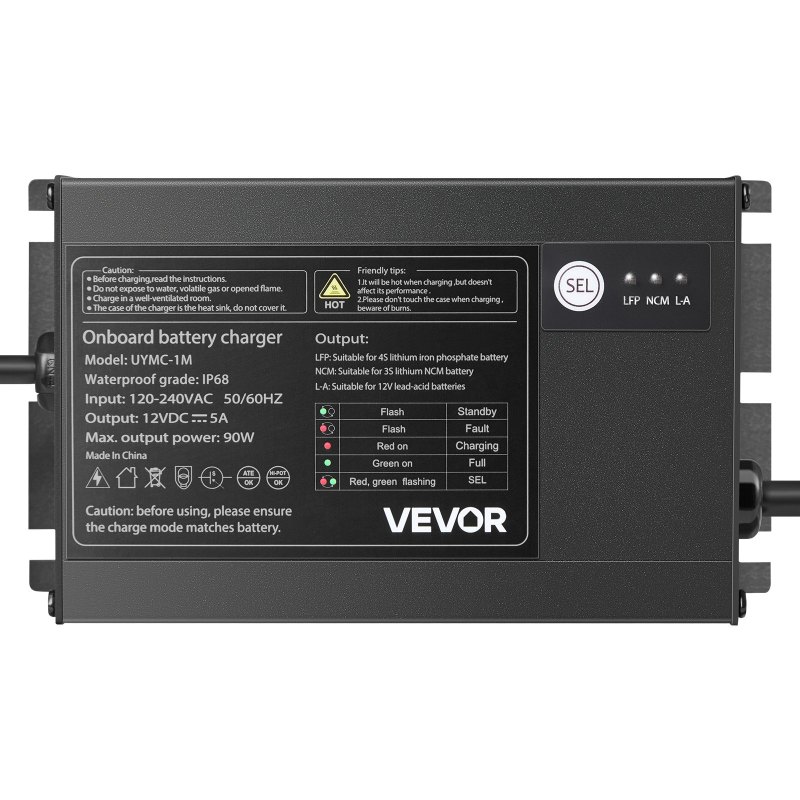 Marine Battery Charger: This on board battery charger provides a stable 12V/5A output, compatible with lead-acid and lithium-ion batteries. Three charging modes (LFP, NCM, L-A) ensure efficient, secure charging for various battery types