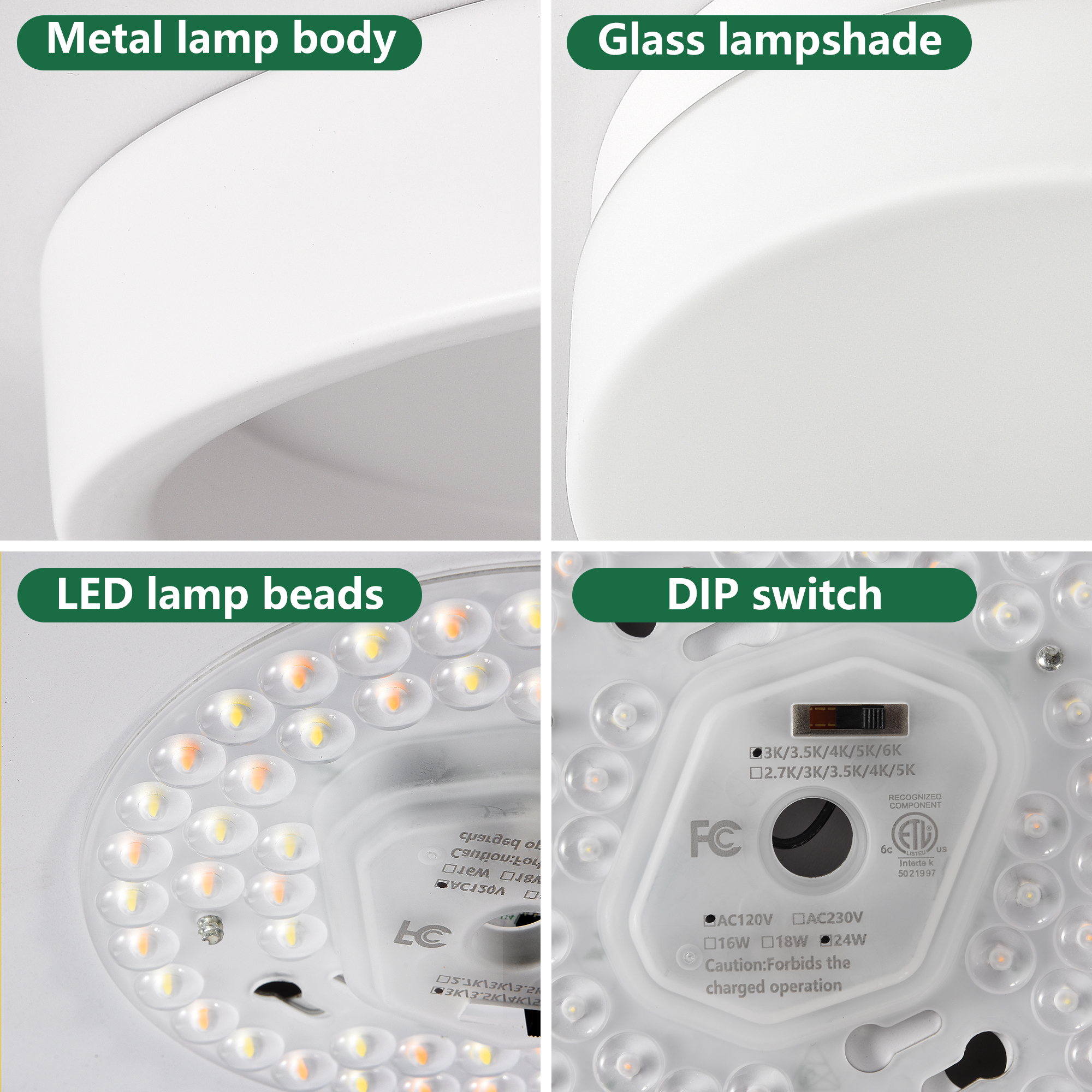[Energy Saving & 3 Color Modes]Equivalent to a traditional 100W two-bulb, LED ceiling light only has 24W low power consumption, which can save up to 90% on your home electricity bills by replacing your old lighting fixtures . In addition, our flush mount ceiling light adopts advanced color temperature adjustable chip with 3 color temperatures (Warm White 3000K, Natural White 4000K, Daylight White 6500K)[Safety Defender]: Electric leakage or even potential disasters caused by electricity short circuit. The power supply design of short circuit protection is also involved.CE listed to avoid electrical shock and fire hazard, safe to use. Protect your family's safety[Ultra-Bright Ceiling Light]: Higher lumens and lower energy consumption;Equipped with 100 premium leds,The fceiling lamp offers higher lumens and lower power, which can illuminate space about 216ft².The brightness of this 24W led ceiling light is equivalent to 100W traditional incandescent light[Easy Installation + Long Lifespan ]- Clear instructions included, just take 3 easy steps, Flush mount fixture can be fitted quickly in few minutes. Adopting high quality LEDs inside and up to 25000hrs lifespan, 20 times longer than a typical incandescent light. Providing you with a stable and soft light source for much longer