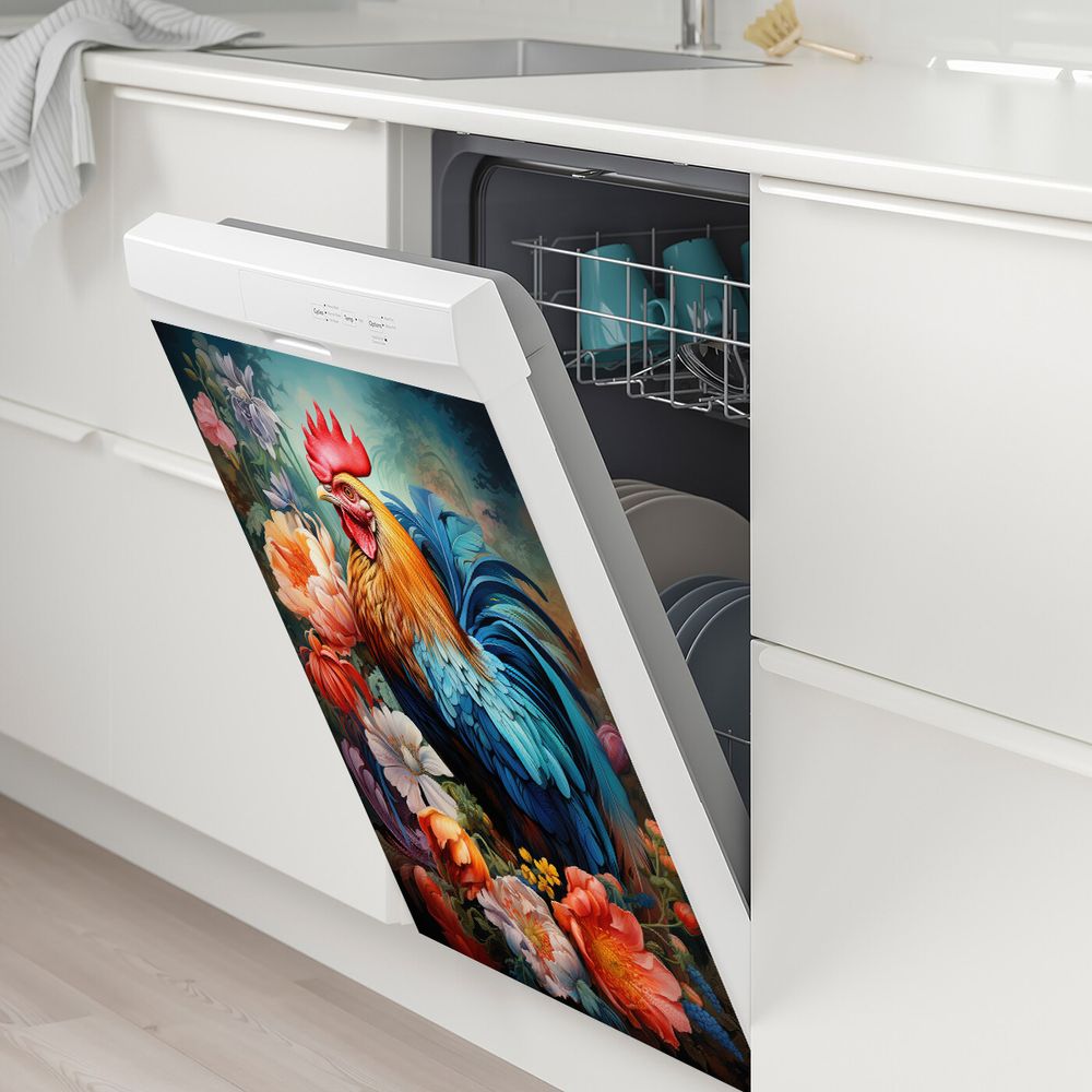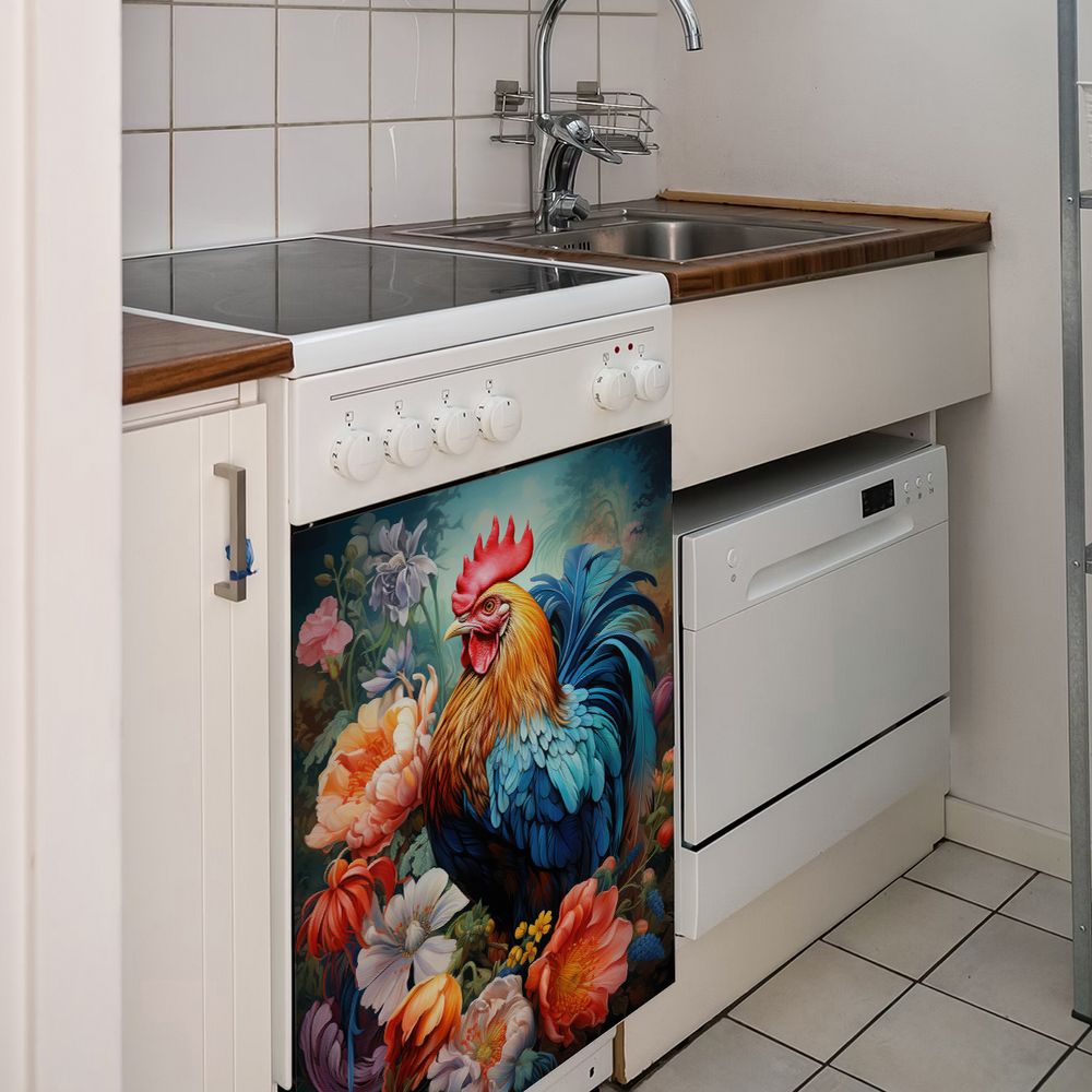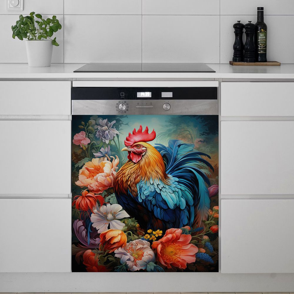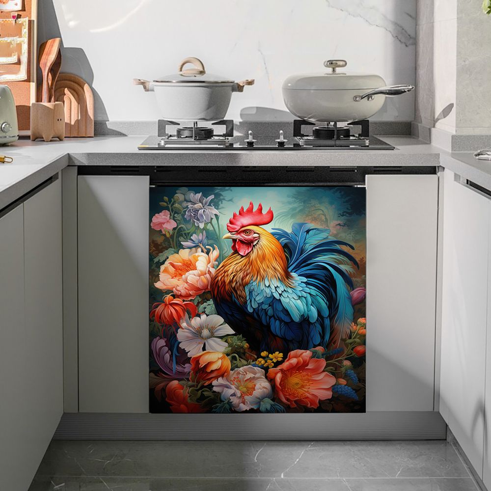 1 Piece 2D Flat Dishwasher Magnet Cover, Rooster And Flowers - Refrigerator Door Sticker, Easy To Clean Appliance Panel Sticker
