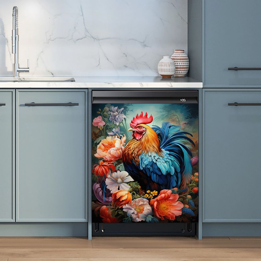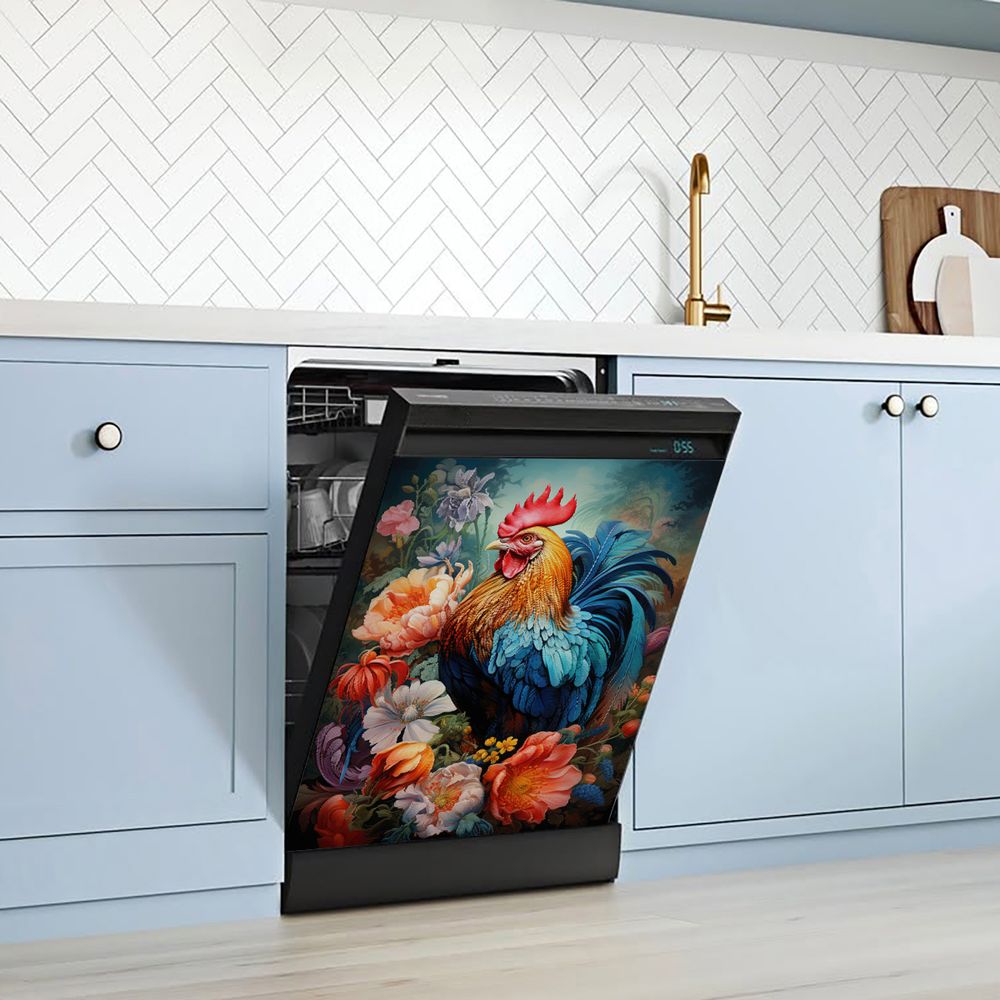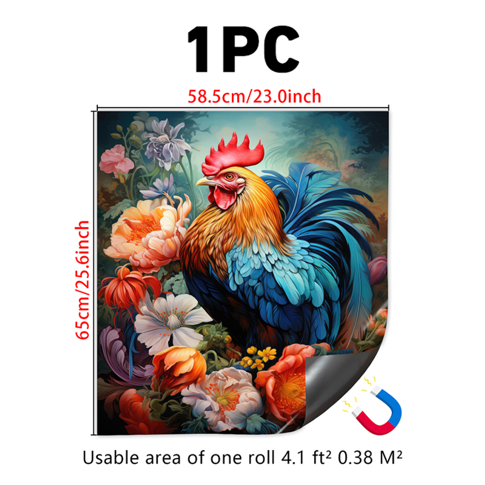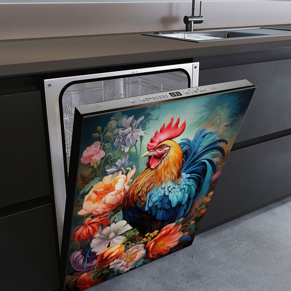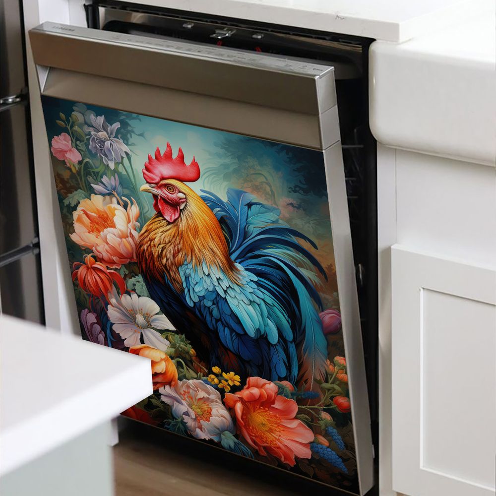 1 Piece 2D Flat Dishwasher Magnet Cover, Rooster And Flowers - Refrigerator Door Sticker, Easy To Clean Appliance Panel Sticker