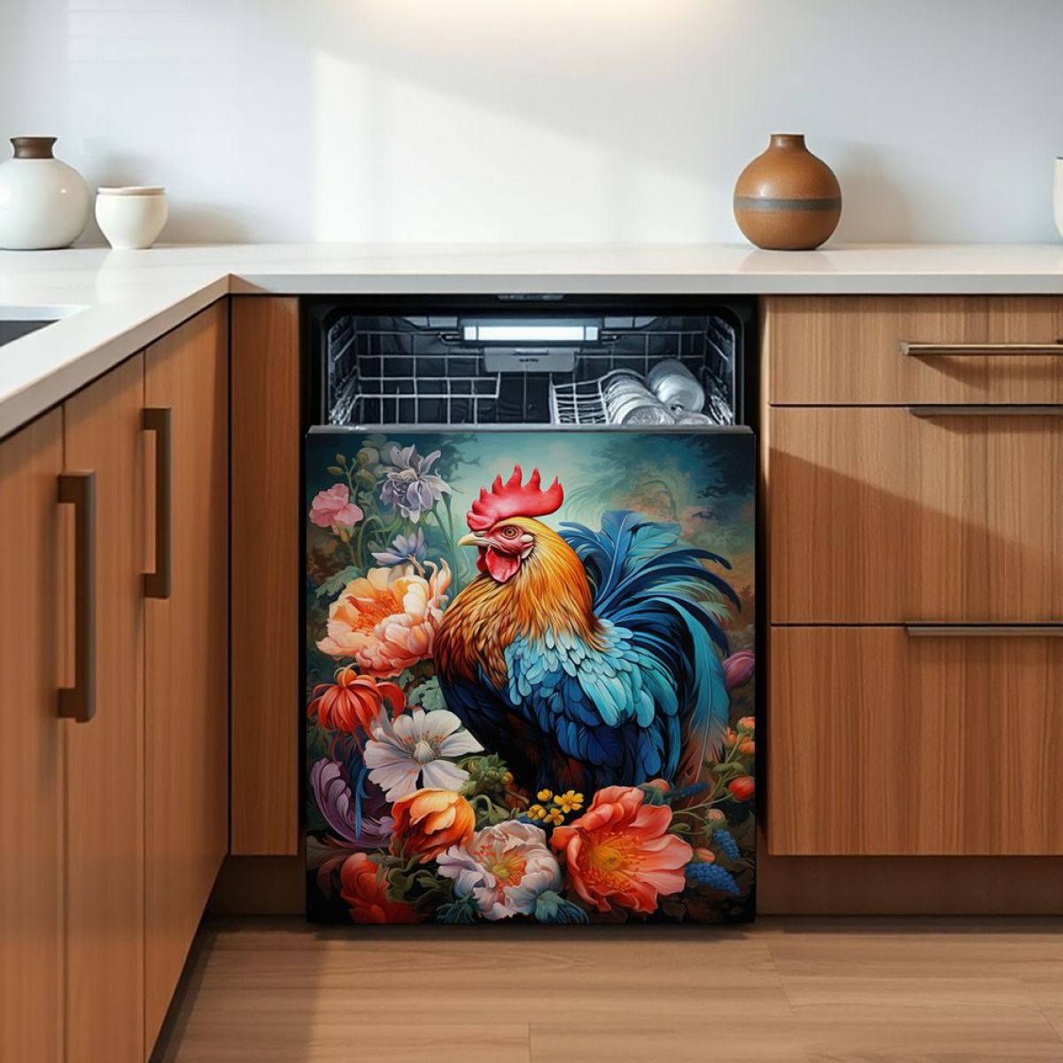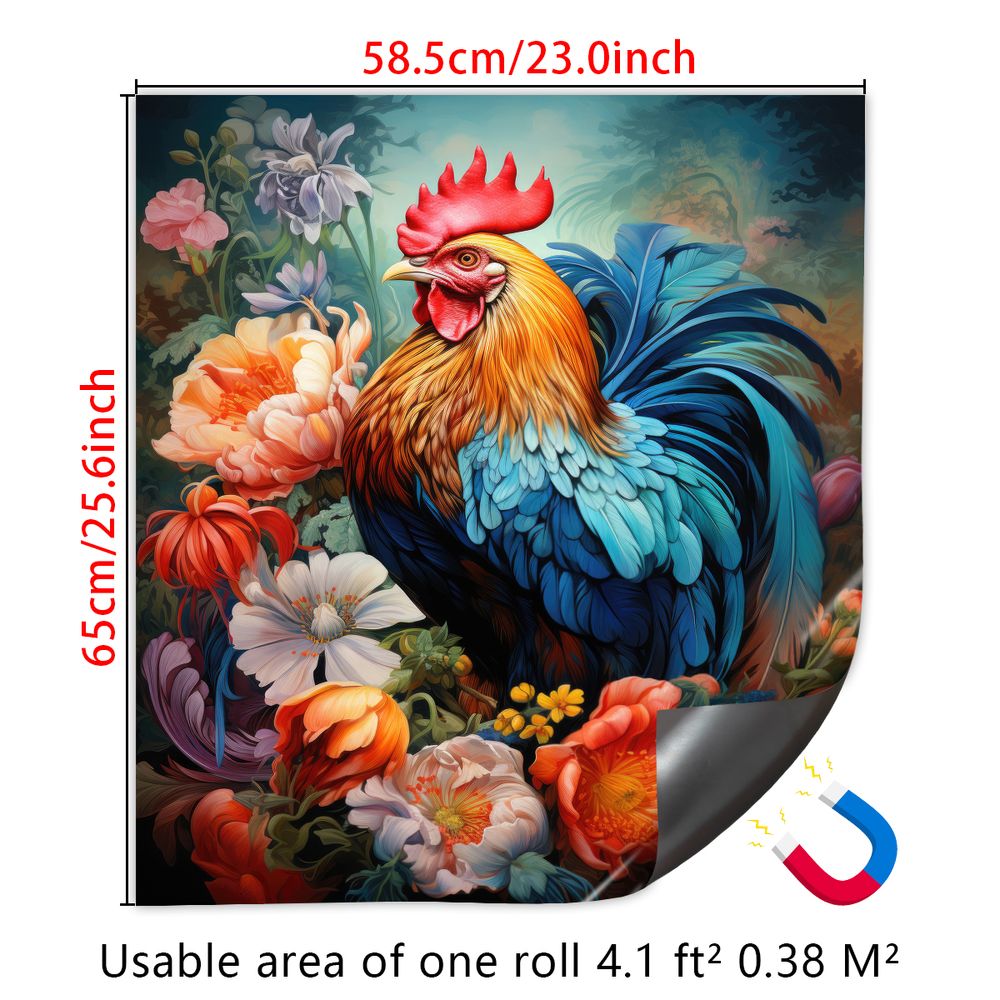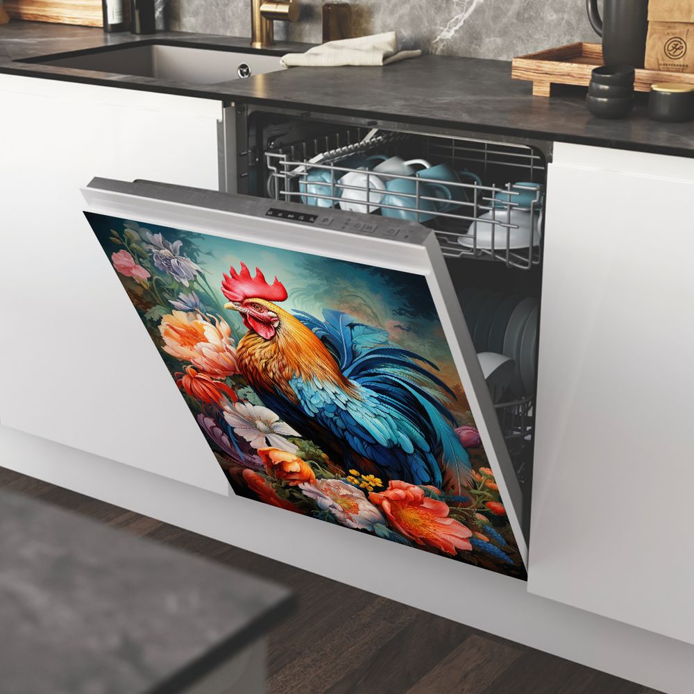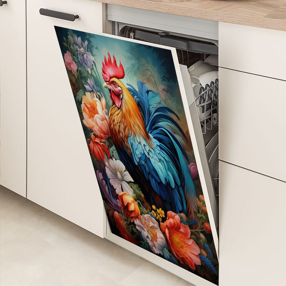1 Piece 2D Flat Dishwasher Magnet Cover, Rooster And Flowers - Refrigerator Door Sticker, Easy To Clean Appliance Panel Sticker