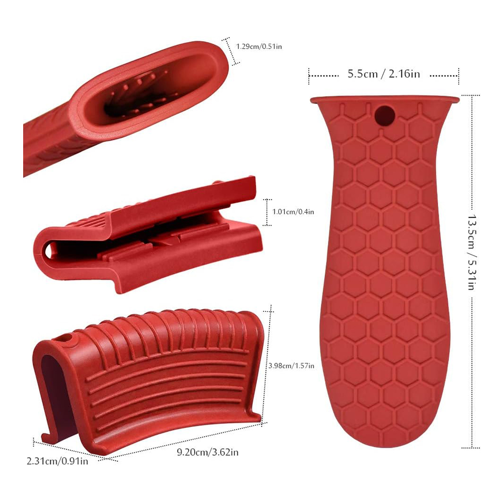 2.Anti-slip design: these hot resistant pot sleeve grip handle holders feature honeycomb pattern design on the outside and concave-convex design on the inside to make the handle holder grip stronger and less slippery; The silicone hot skillet handle cover has a handy hanging hole if you prefer to store on a hook, making cooking, baking, etc. in your kitchen easier and fun