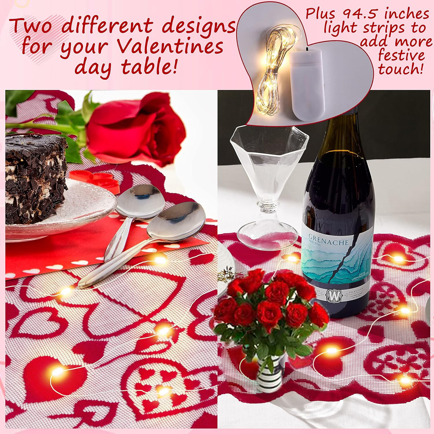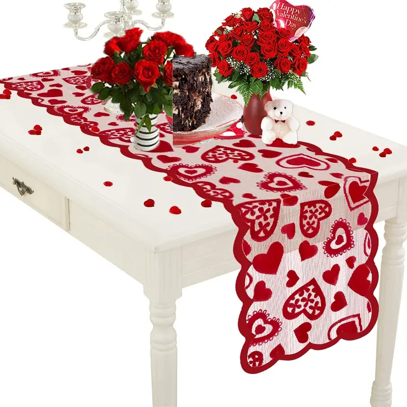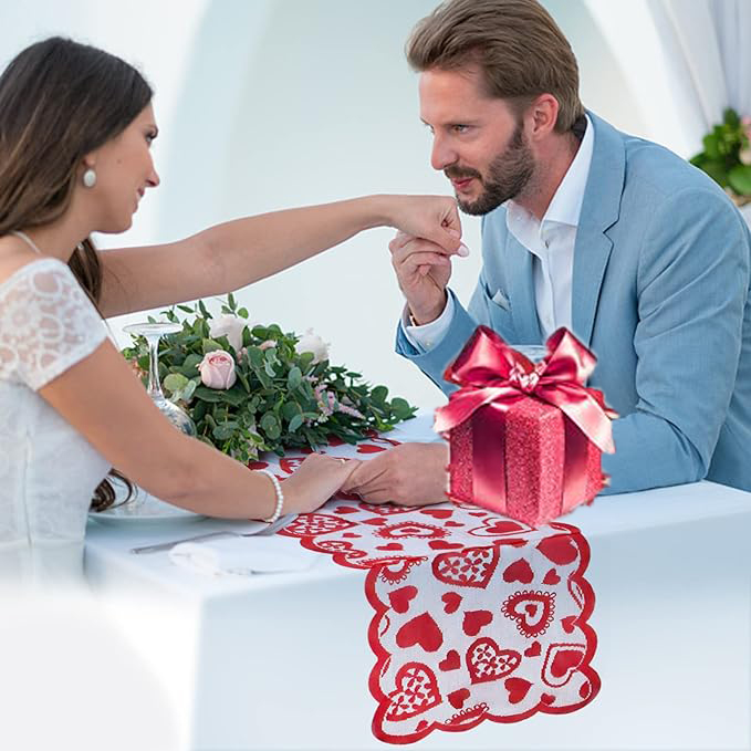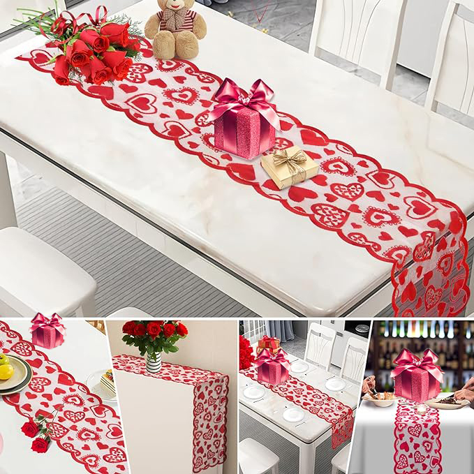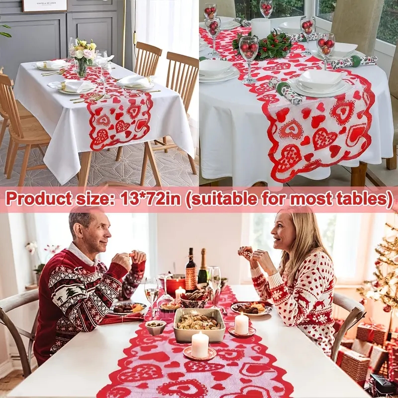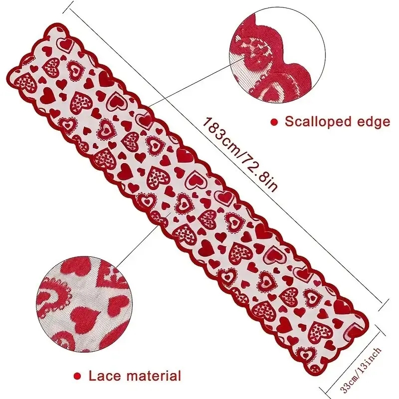 Sweet and romantic design, Lace material, the table runner features connective different sizes of red heart shapes, the wavy edge design makes the tablecloth more adorable and delicate
