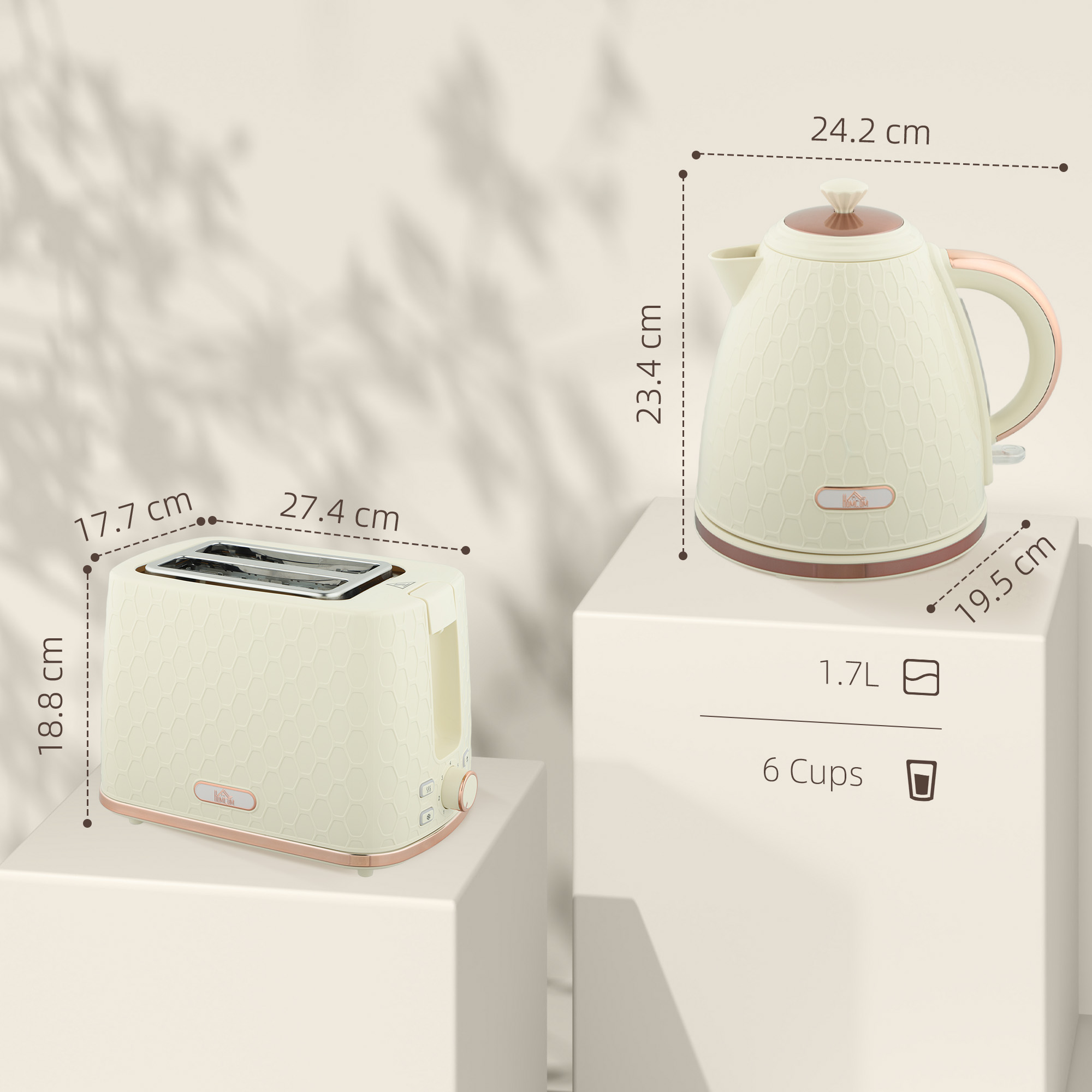 • 1.7L fast boil kettle and matching two-slice toaster. Stylish honeycomb design