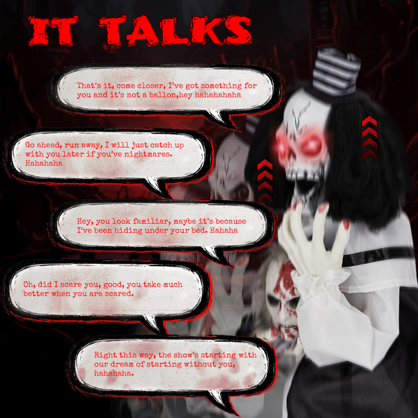 1. Creepy Sound-Activated Performance: Triggered by sound, the clown's red eyes glow, it lets out scary phrases, and starts bouncing to create an eerie and surprising Halloween experience.