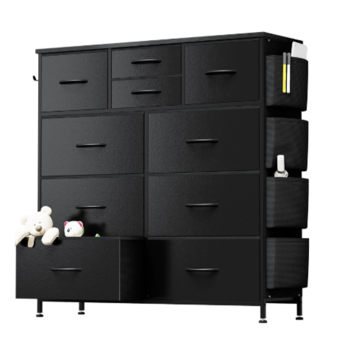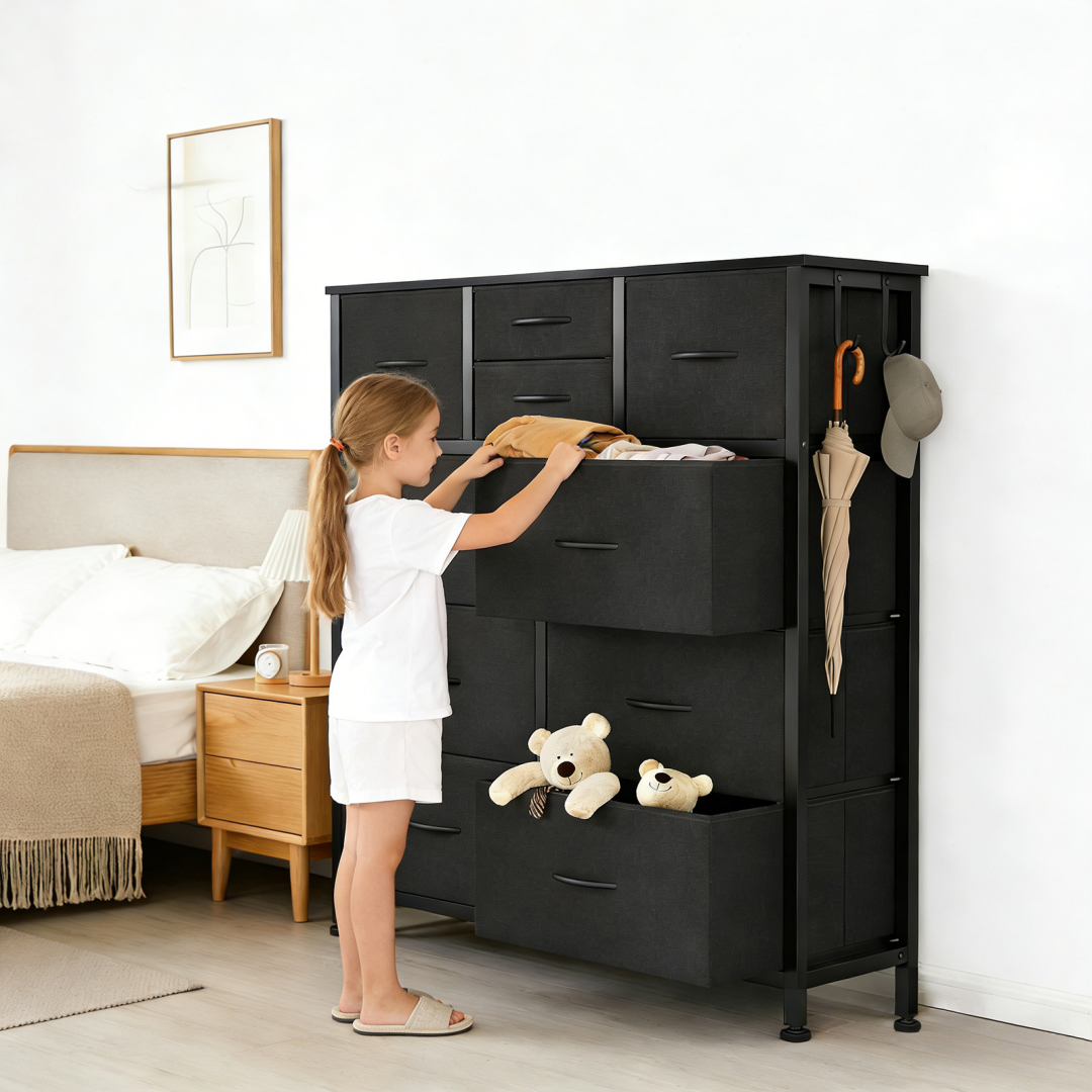【 Reinforced and sturdy Structure 】 Sturdy metal frame, 12mm thick wooden top, layered non-woven fabric /PVC drawers, sturdy and anti-deformation, reliable support for heavy objects.