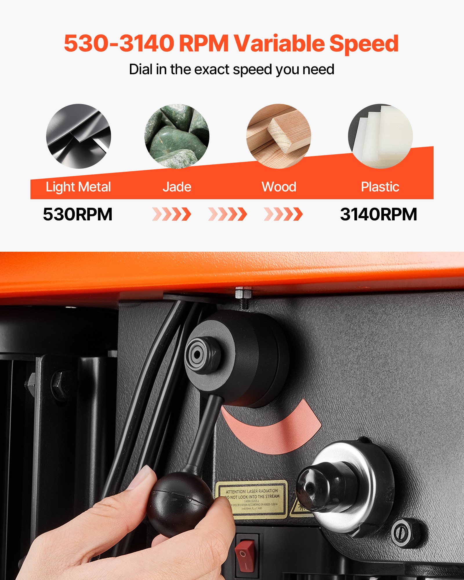 Variable Speed Control: This bench drill press provides variable speed from 530 to 3140 RPM with a digital readout, allowing quick adjustments for different materials and projects